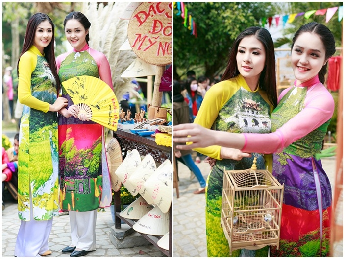 Thiết kế áo dài nhiều màu sắc, in hình danh lam thắng cảnh Việt của NTK Minh Hạnh giúp hoa hậu Ngọc Hân và á hậu Hoàng Anh nổi bật trên những con phố đậm hồn quê Việt dịp đầu năm mới.