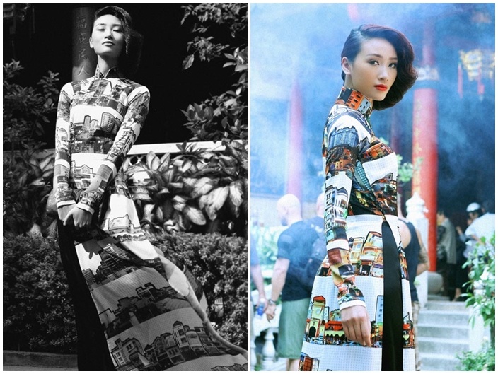 Quán quân Vietnam's Next Top Model mùa đầu - Huyền Trang nổi bật và cá tính trong mẫu áo dài in họa tiết phố Sài Gòn xưa của NTK Công Trí. Mẫu thiết kế nằm trong BST Cám ơn Sài Gòn được anh giới thiệu trong dịp cuối năm 2013. Ảnh: Kim BTN