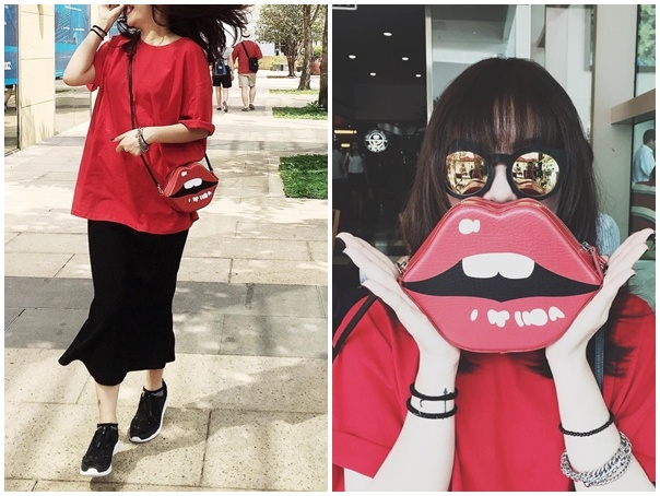 | Trên đường phố Sài thành, ca sĩ Yến Trang diện bộ cánh áo thun rộng và chân váy dài, phụ kiện túi đôi môi làm điểm nhấn nổi bật. Nữ ca sĩ hào hứng khoe chiếc túi ngộ nghĩnh đang được giới trẻ thế giới ưa chuộng. |