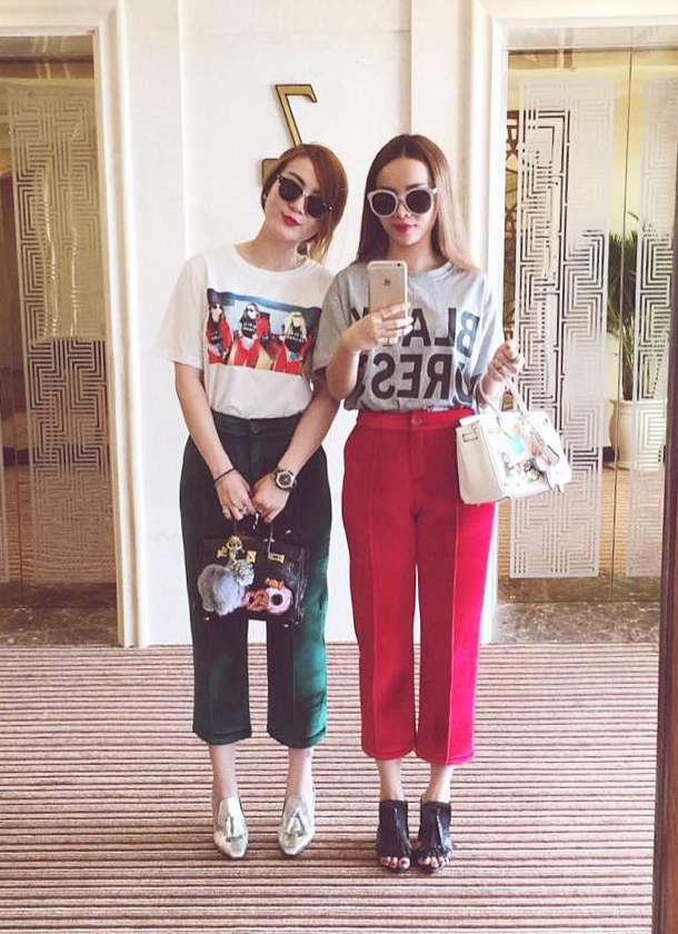 | Yến Trang cùng em gái Yến Nhi diện ton-sur-ton khi xuống phố. Cặp chị em diện áo thun đơn giản cùng quần âu dáng suông. Cả hai đón đầu phụ kiện túi Philosophy đang hot. |