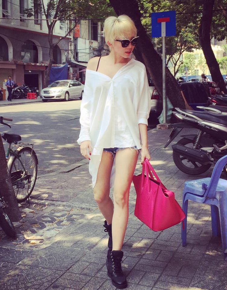 | Tuần qua, Tóc Tiên giữ vững phong độ thời trang với cách mix & match quen thuộc. Cô diện áo sơ-mi dáng dài cùng quần jeans ngắn, khoe lợi thế đôi chân thon dài. Phụ kiện túi, giày, kính hiện đại thêm phần ấn tượng cho tổng thể. Giọng ca Tóc mây vẫn giữ mái tóc bạch kim cá tính. |