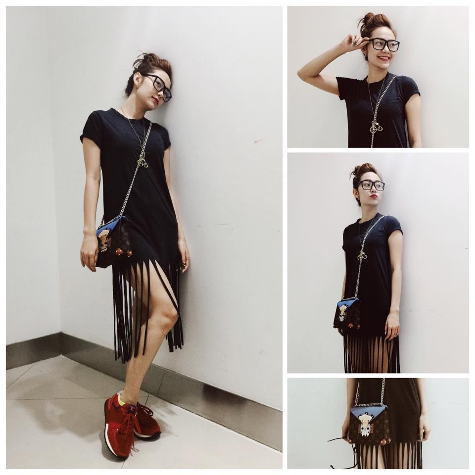 | Minh Hằng chọn gu tinh nghịch khi xuống phố tuần qua. Nữ ca sĩ diện váy thun tối màu, chi tiết tua rua làm điểm nhấn phong cách. Đi kèm trang phục theo kịp trào lưu là giày bata khỏe khoắn và túi xách hàng hiệu cá tính. |