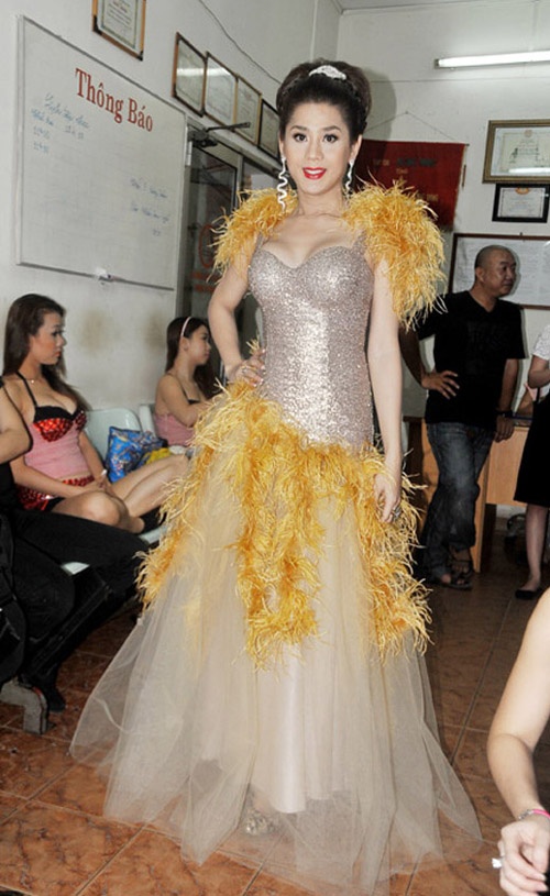 | Phi Thanh Vân luôn chuộng những chiếc váy pha màu "sến sẩm", những chi tiết đính đá càng giúp người đẹp thêm "hai lúa". |
