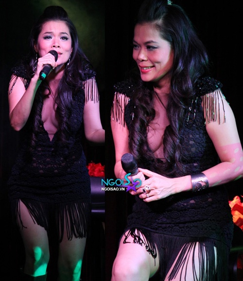 | Mỹ Lệ diện chiếc váy tua rua như chổi lau nhà trên sân khấu, người đẹp còn khoe vòng 1 "thả rông" có phần phản cảm. |