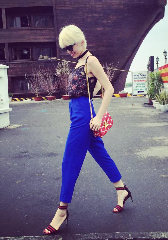 | Trà Ngọc Hằng làm điểm nhấn phong cách trong tuần nhờ set trang phục tinh tế về màu sắc lẫn kiểu dáng. Thời gian này, người đẹp chuộng giày vans đế bằng tiện lợi. |