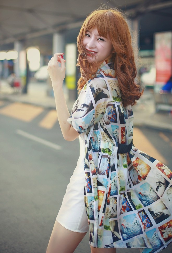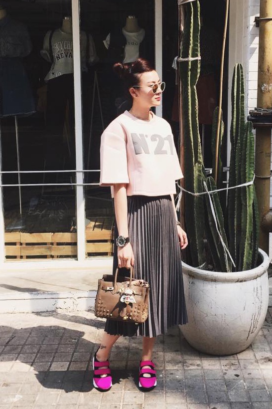 | Trên đường phố Sài thành, Kha Mỹ Vân nổi bật với dáng vẻ hao gầy, cá tính. Cô lăng xê mốt váy xếp ly và trang phục họa tiết màu sắc. |