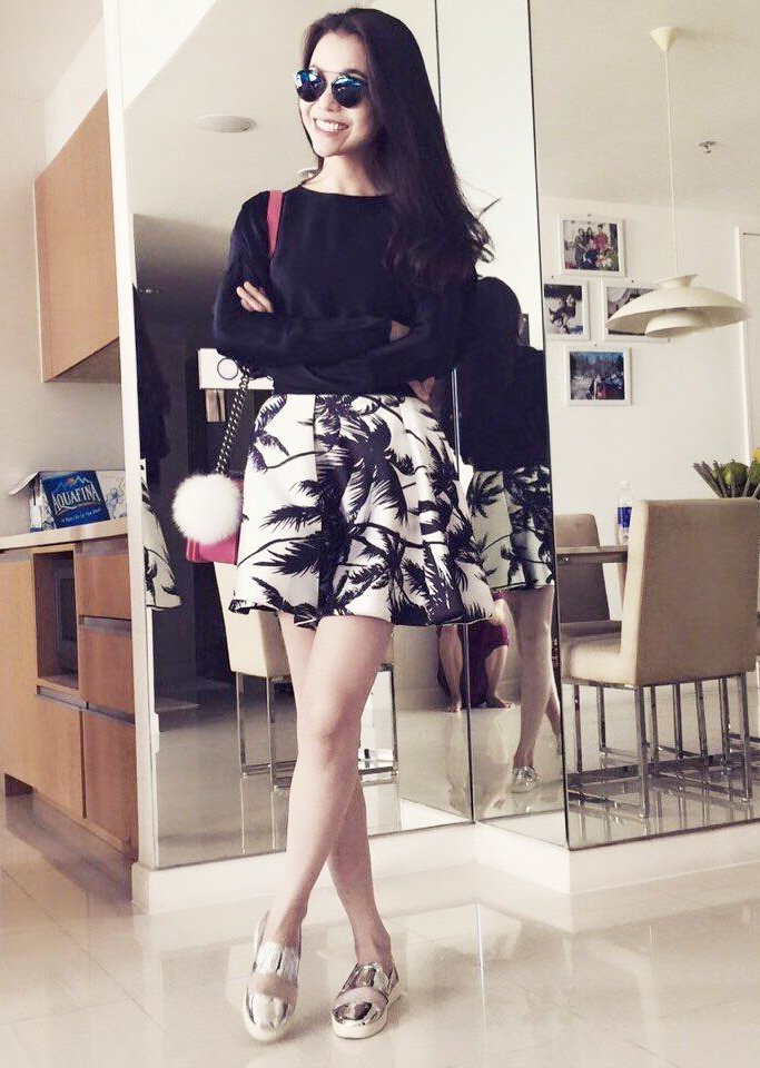 | Mâu Thanh Thủy yêu thích những gam màu trầm khi xuống phố. Tuần qua, người mẫu ứng dụng mốt váy hai dây, chân váy xếp ly, áo ba lỗ và giày thể thao cá tính. Các set trang phục của Mâu Thủy thể hiện phong độ mix & match tinh tế. |