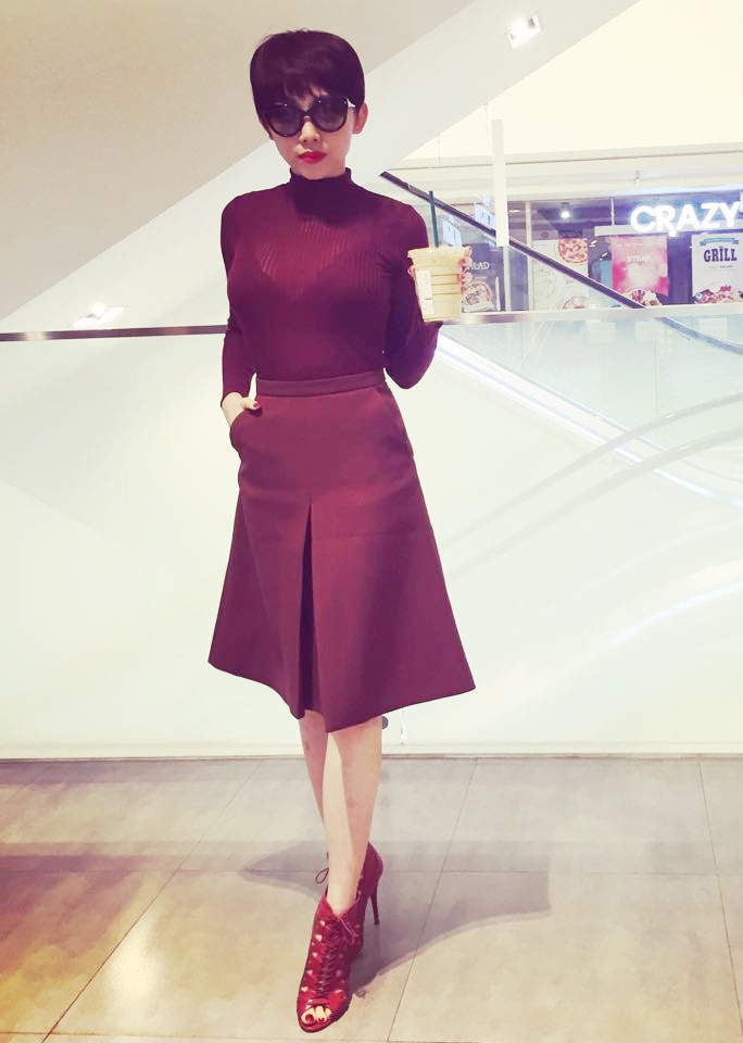 | Một ngày khác, nữ ca sĩ hải ngoại diện trang phục kín đáo. Tông màu đỏ booc-đô hợp xu hướng. Lần này, giọng ca Tóc mây thay đổi màu tóc từ bạch kim sang đen tuyền truyền thống. Dù chọn kiểu tóc nào, người đẹp vẫn tạo được dấu ấn hình ảnh riêng. |