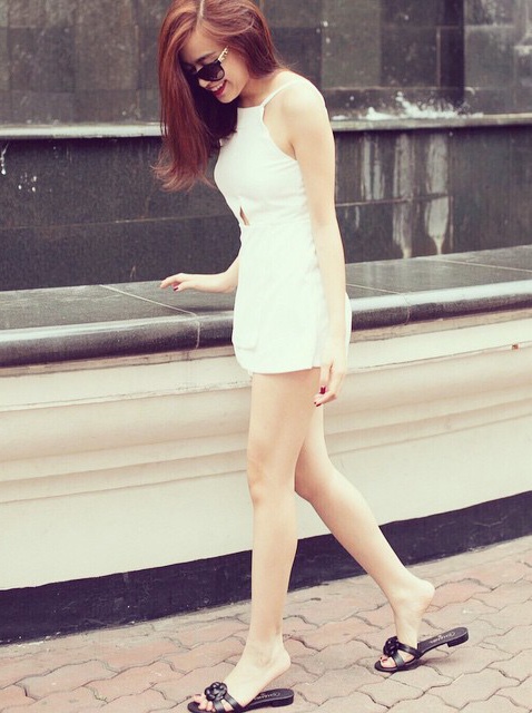 | Trong khi đó, tại Hà Nội, Hoàng Thùy Linh ăn vận khá thoải mái với bộ váy trắng ngắn rất phong cách. Nữ ca sĩ còn đi dép lê thoải mái khi sải bước trên phố. |
