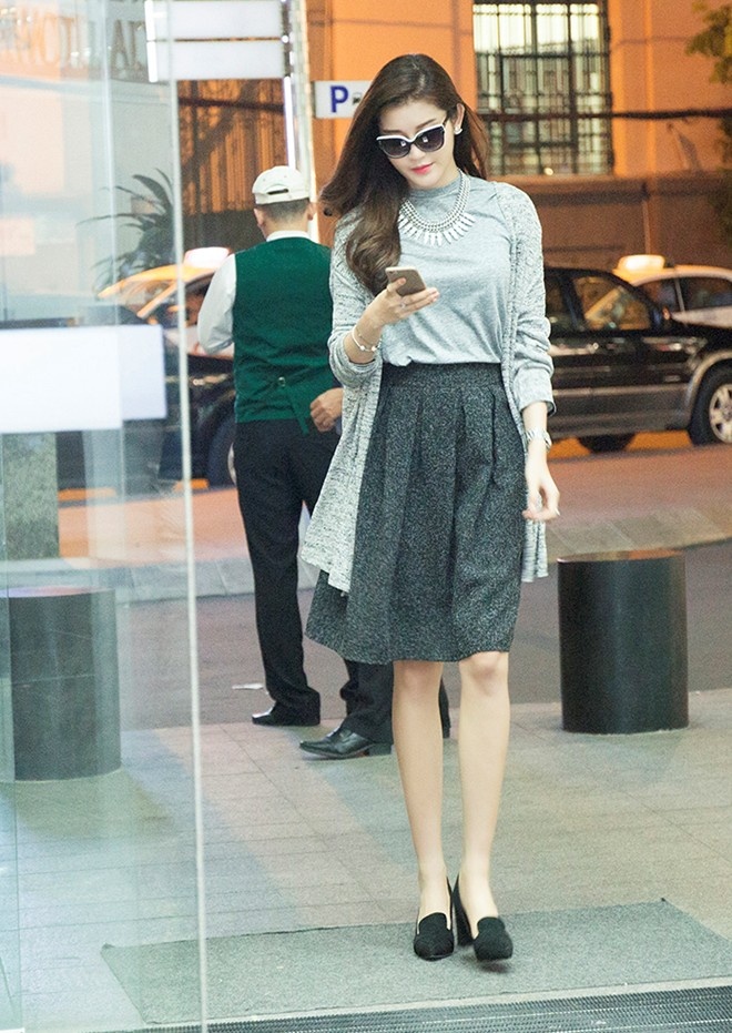 | Huyền My chọn set đồ tông màu trầm với sắc xám, trắng. Hình ảnh thanh lịch, nền nã ghi điểm cộng hình tượng cho á hậu 20 tuổi. |