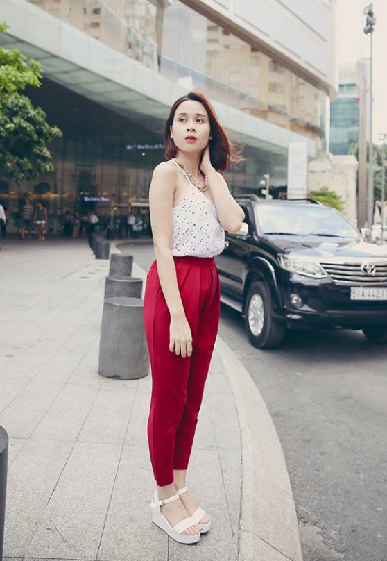 | Trên đường phố tấp nập, Lưu Hương Giang nổi bật với hình ảnh phóng khoáng. Cô diện áo hai dây mix kèm quần lai cao và sandal đế "bánh mì" hợp xu hướng được giới trẻ yêu thích. |