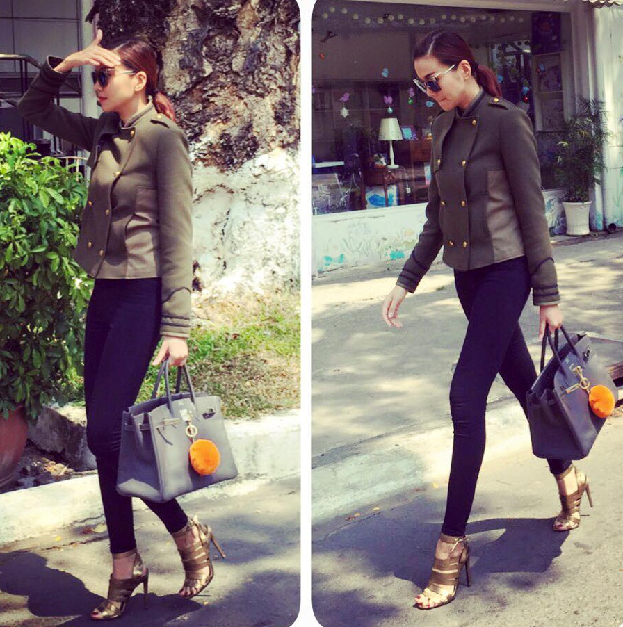 | Trên đường phố Sài thành, Thanh Hằng nổi bật với set trang phục hiện đại, cá tính. Cô chuộng mốt áo khoác màu xanh quân đội, mix ăn ý cùng giày ánh kim loại đồng màu. |