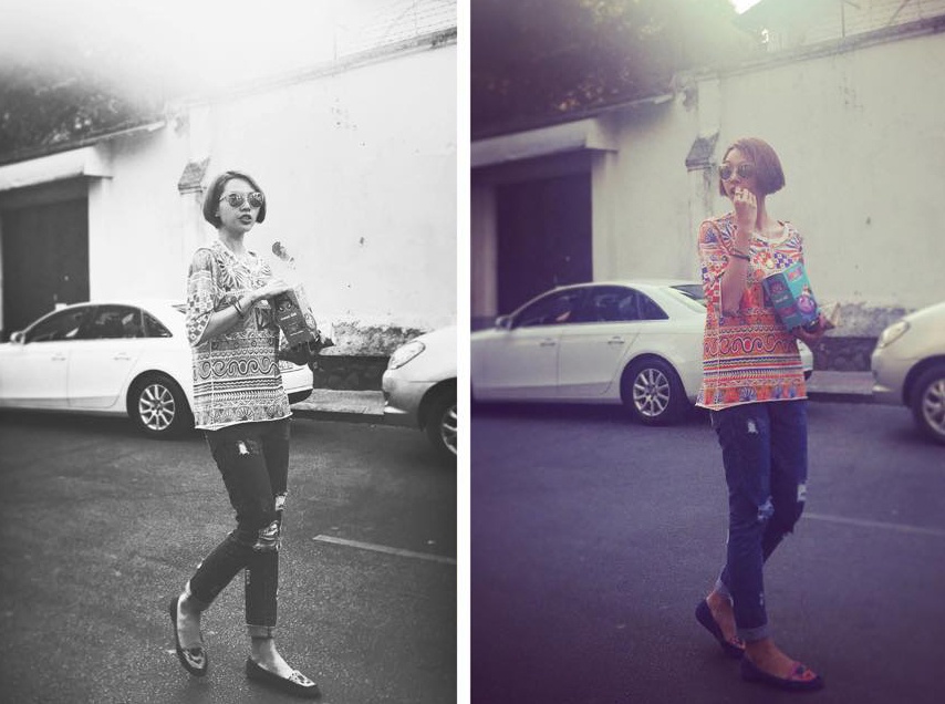 | Tuần qua, nữ người mẫu cá tính Minh Triệu ăn vận đời thường với jeans rách và áo thun họa tiết. |