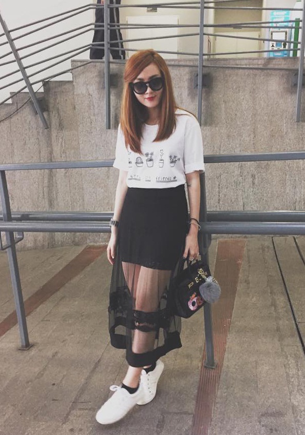 | Ca sĩ Yến Nhi cho thấy khả năng đón đầu các xu hướng thời trang châu Á với cách mix ngẫu hứng giữa chân váy voan xuyên thấu và áo thun đơn giản. |