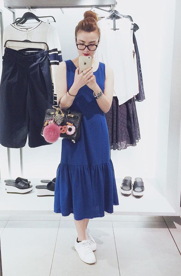 | Trong ảnh là set trang phục được khen ngợi của "Én em". Nữ ca sĩ Sài thành ghi lại hình ảnh khi chọn được bộ váy hạ eo, tông màu xanh dương đang được yêu thích. |