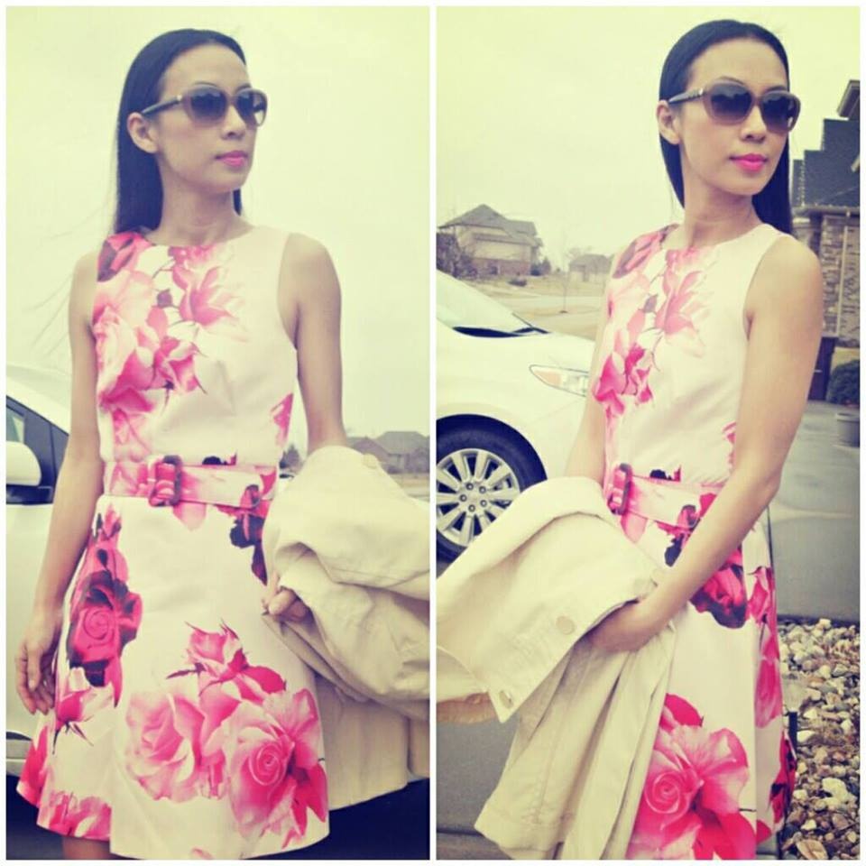 MC Huyền Ny nổi bật với bộ váy phong cách cổ điển, họa tiết hoa màu hồng ngọt ngào nổi bật trên nền vải trắng. Thắt lưng đồng chất liệu tạo điểm nhấn trang nhã.