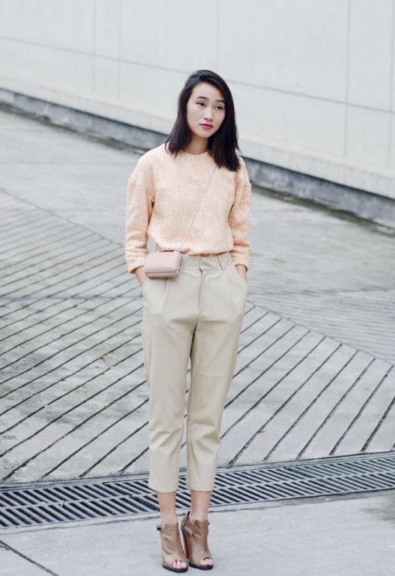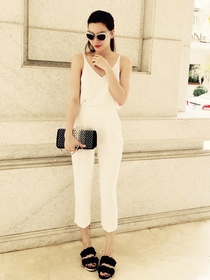 | Người mẫu Trang Khiếu diện bộ cánh trẻ trung, thanh lịch khi xuống phố. Gam màu trắng kem được mix & match ăn ý. |