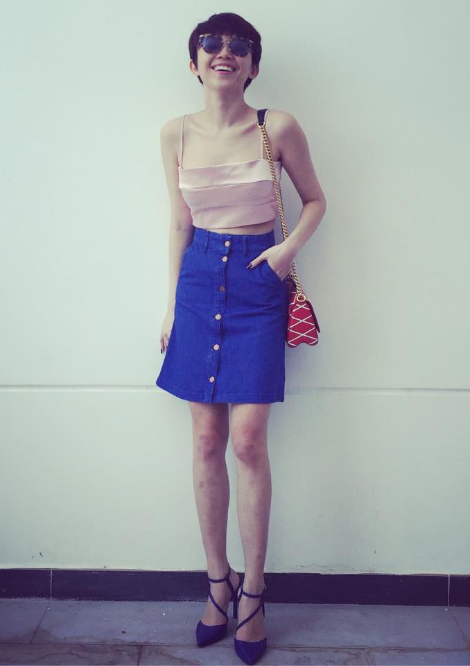 | Ca sĩ Tóc Tiên lăng xê mốt áo crop-top chất liệu lụa satin sang trọng. Người đẹp cũng đón đầu trào lưu váy cài cúc trước. Tổng thể đẹp mắt hơn nhờ phụ kiện giày và túi xách. |