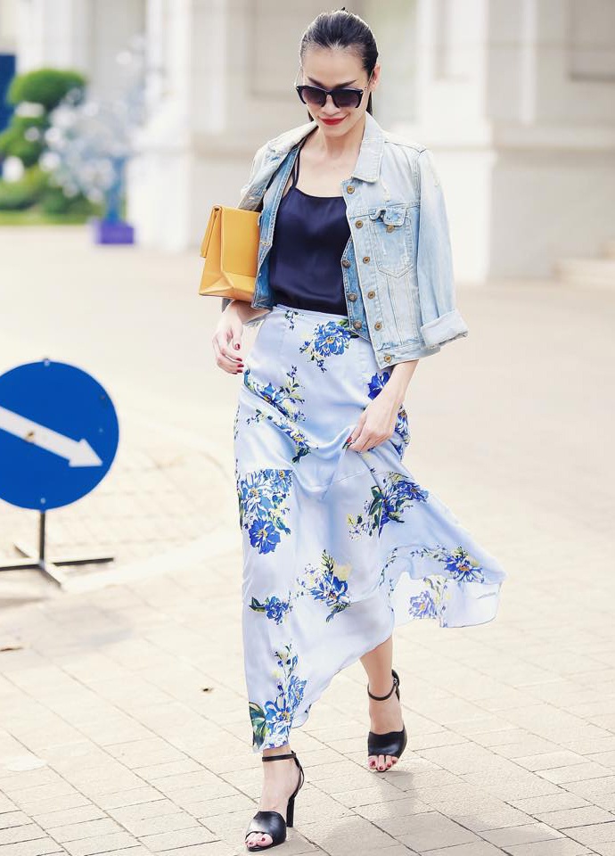 | Tại Việt Nam, icon thời trang Thanh Trúc xuống phố với bộ cánh tông xanh dịu mát. Chân váy voan họa tiết hoa hợp xu hướng, được mix ăn ý cùng áo jacket denim. |