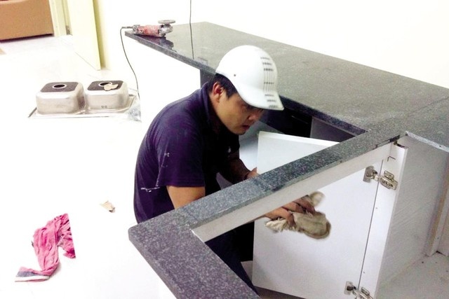 | Anh Nguyễn Đình Cường (quê ở Đông Sơn, Thanh Hóa) đang thi công lắp đặt bệ bếp cho một gia đình ở quận Hoàng Mai, Hà Nội. |