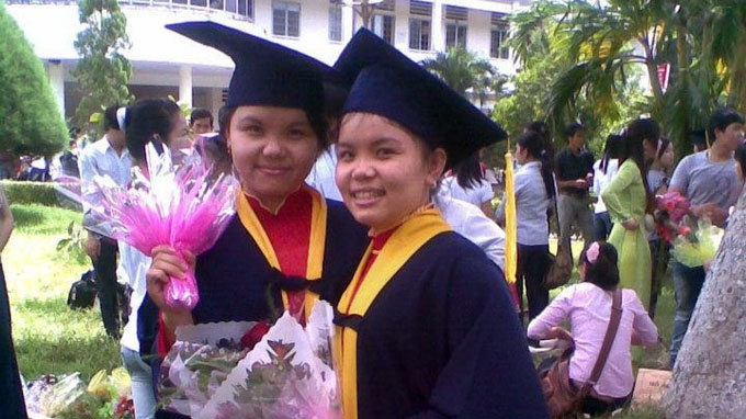 | Hai chị em sinh đôi Đặng Thị Thanh Thảo và Đặng Thị Thu Thảo trong ngày tốt nghiệp cử nhân sư phạm, ĐH Đồng Tháp năm 2011 - Ảnh: Nhân vật cung cấp. |