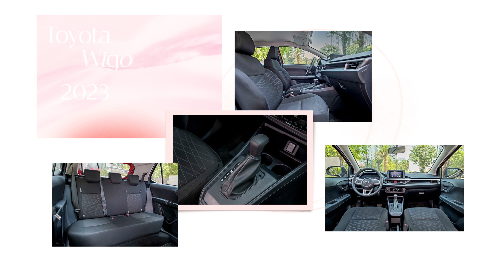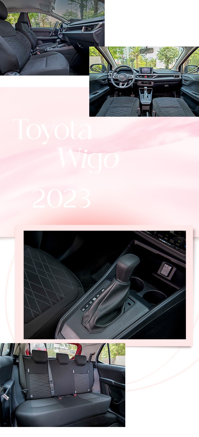 Xét về kích thước, Toyota Wigo phiên bản 2023 rất nhỏ gọn, phù hợp di chuyển trong đô thị với bán kính quay đầu thấp nhất trong phân khúc (4,5 m). Khoảng sáng gầm 160 mm - cao nhất phân khúc - cũng giúp xe dễ dàng di chuyển trên một số địa hình. Bước vào bên trong, khoang xe cũng mang đến cảm giác thoải mái, dễ chịu khi ngồi. Toyota Wigo có không gian nội thất rộng nhất phân khúc với chiều dài cơ sở là 2.525 mm cùng khoảng cách giữa 2 hàng ghế lên đến 910 mm đủ để gia đình ngồi thoải mái. Ngoài ra, thể tích khoang hành lý là 261 lít và có thể tăng lên tới 276 lít khi bỏ tấm ngăn.