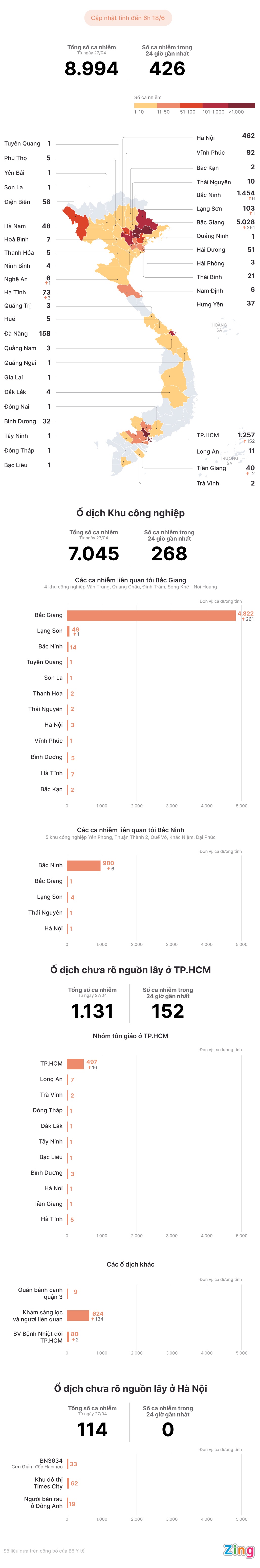 Từ 27/4 đến nay, Việt Nam đã ghi nhận 8.994 người mắc Covid-19 tại 40 tỉnh, thành. Đặc biệt, TP.HCM vẫn phát hiện nhiều ca mới chưa rõ nguồn lây qua khám sàng lọc tại bệnh viện.