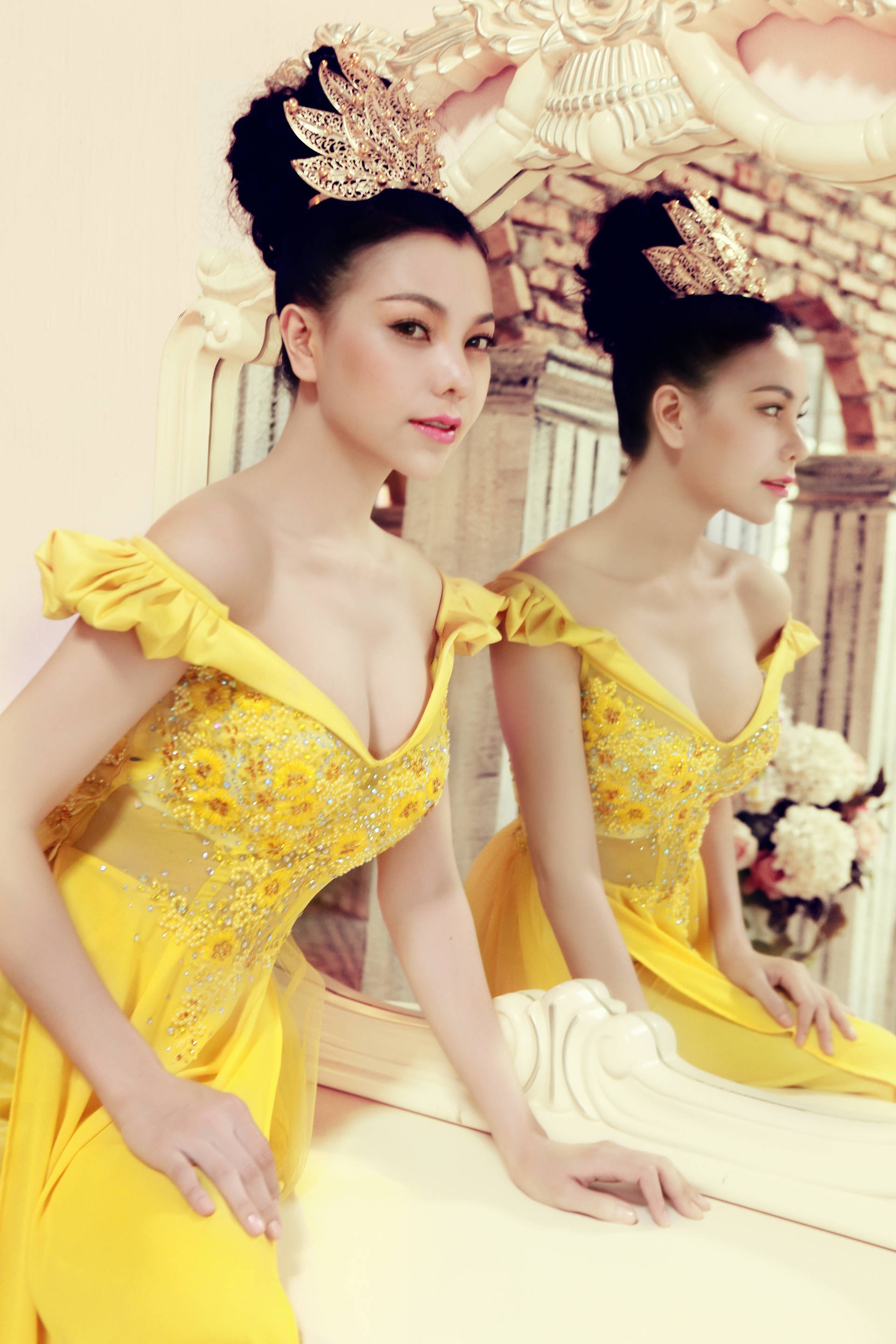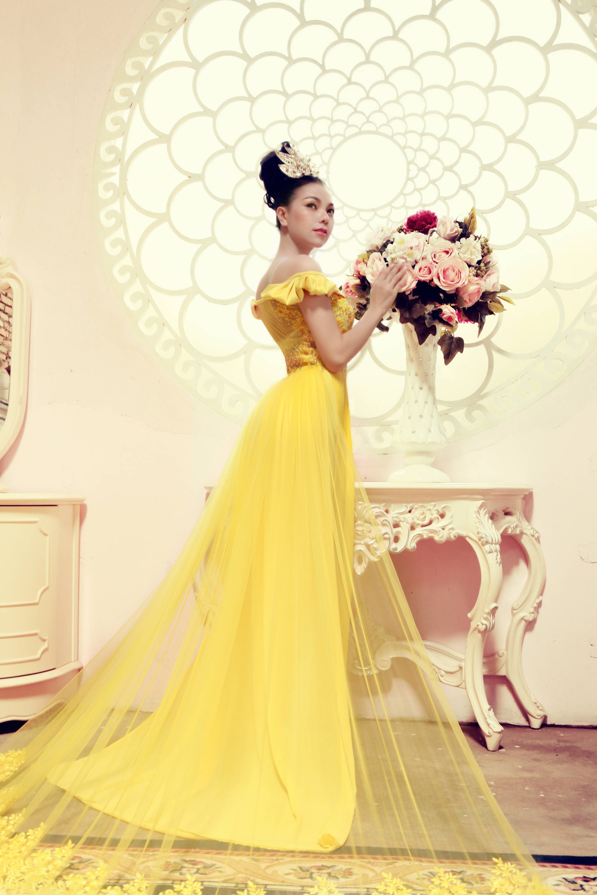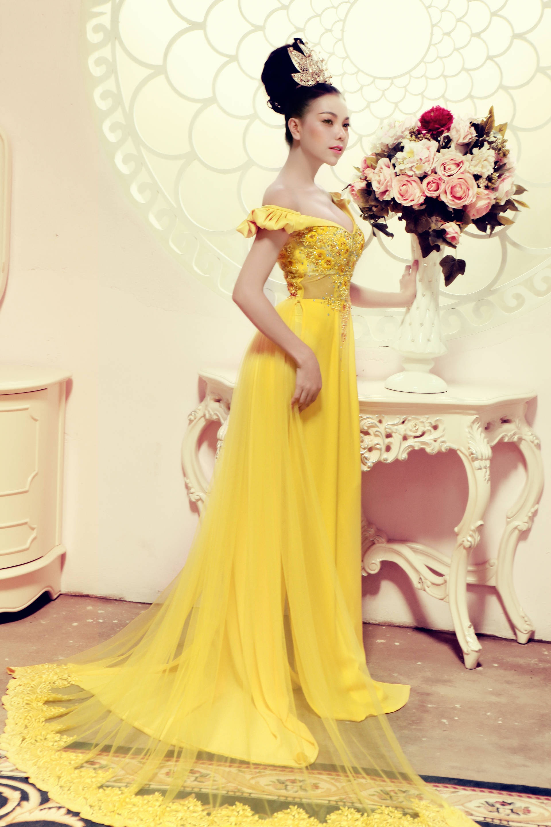 | Thiết kế hướng đến hai tông màu chủ đạo là trắng và vàng. Chất liệu chính là voan, chiffon mềm mại, mang lại vẻ đẹp kiều diễm, tinh tế cho người mặc. |