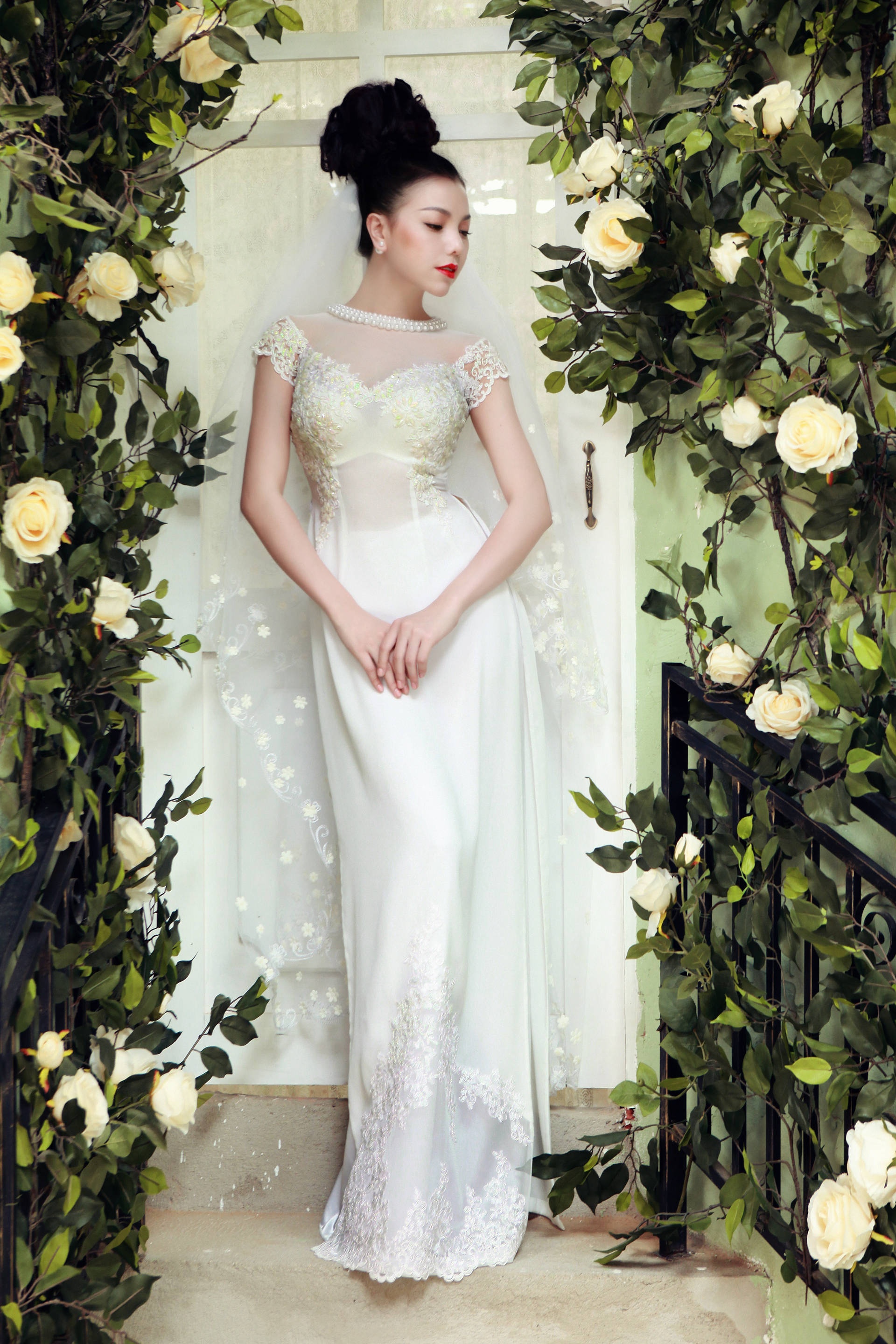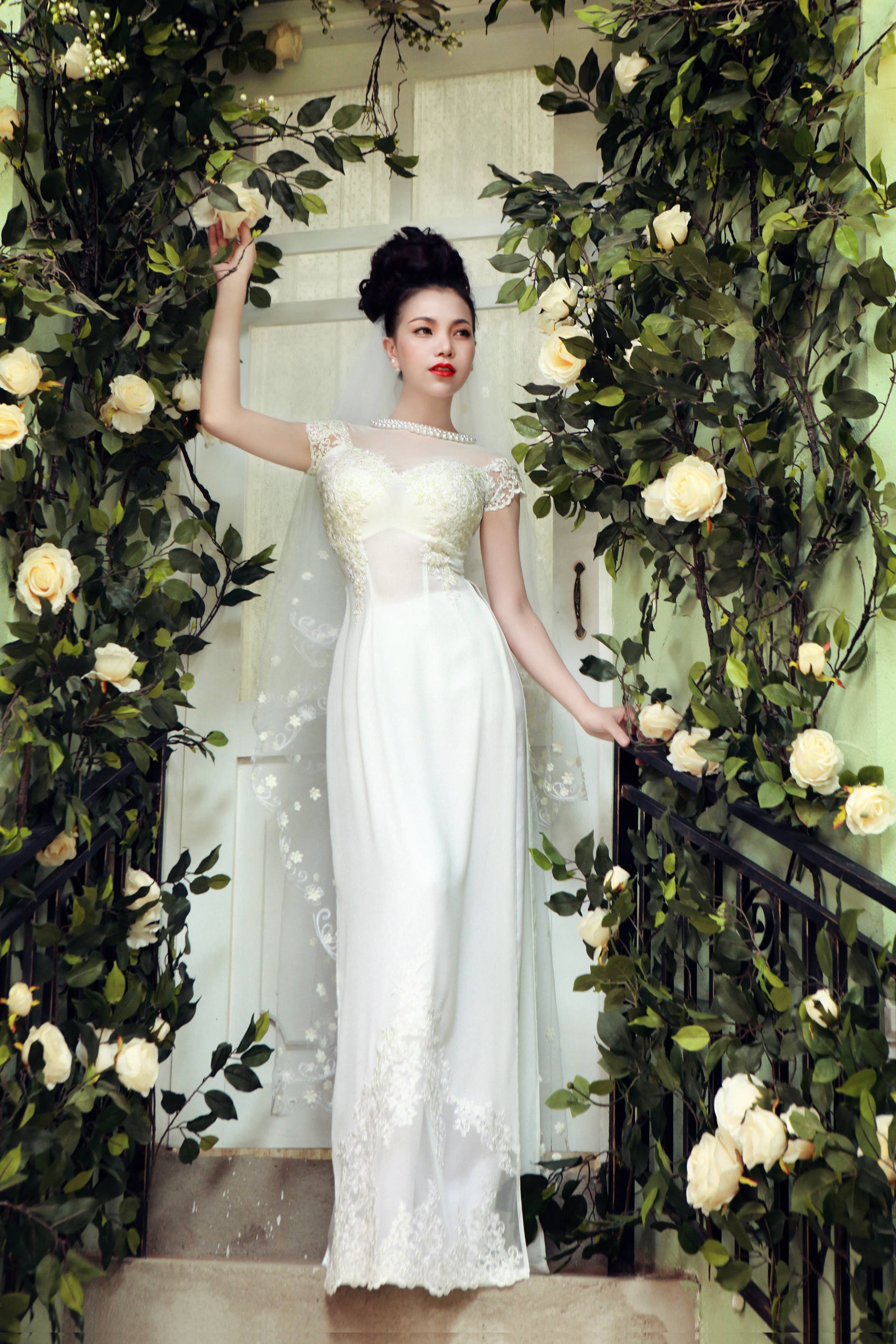 | Trong bộ trang phục kế tiếp, nữ người mẫu trông thanh thoát và kiều diễm với mẫu áo dài ren tông màu trắng tinh tế. Thiết kế có chất liệu cao cấp, thể hiện sự mềm mại, sang trọng, trong trẻo của cô dâu. |
