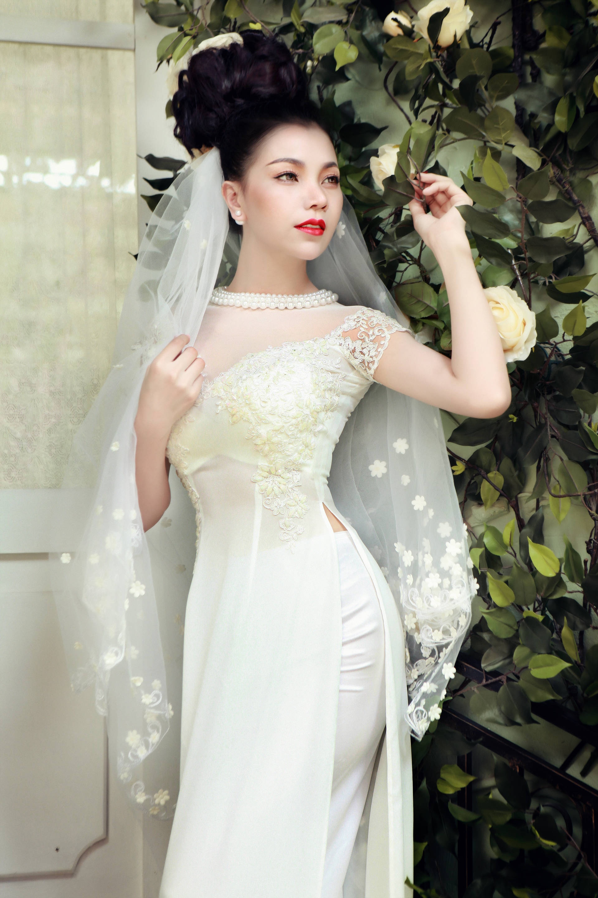 | Điểm nhấn của trang phục là phần cổ trễ, khoe lợi thế ngoại hình đầy đặn, bờ vai thon của người mặc. Vẻ đẹp đầy sức hút của Trà Ngọc Hằng được khen ngợi là phù hợp với những mẫu áo dài cưới cách tân, phù hợp với hình ảnh sexy, quyến rũ. |