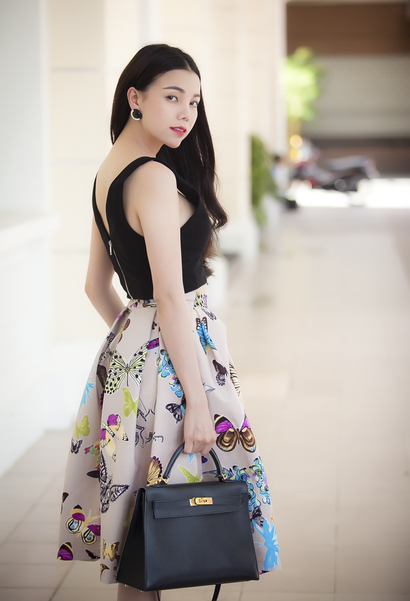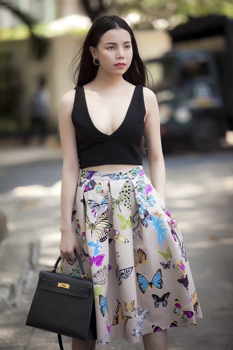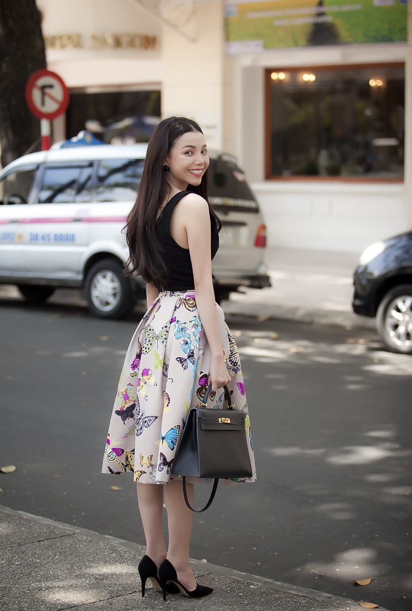 Trà Ngọc Hằng tinh tế với cách phối tông màu. Tông đen tuyền của áo, giày, túi kết hợp ăn ý làm nổi bật chân váy nhiều màu sắc.