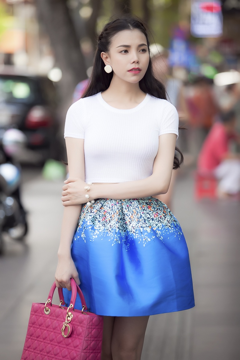 Nữ người mẫu nổi bật trên phố với phong cách thời trang trẻ trung, hiện đại kết hợp gữa áo crop-top đơn giản cùng chân váy xòe nữ tính, kèm áo thun giấu quần phá cách.