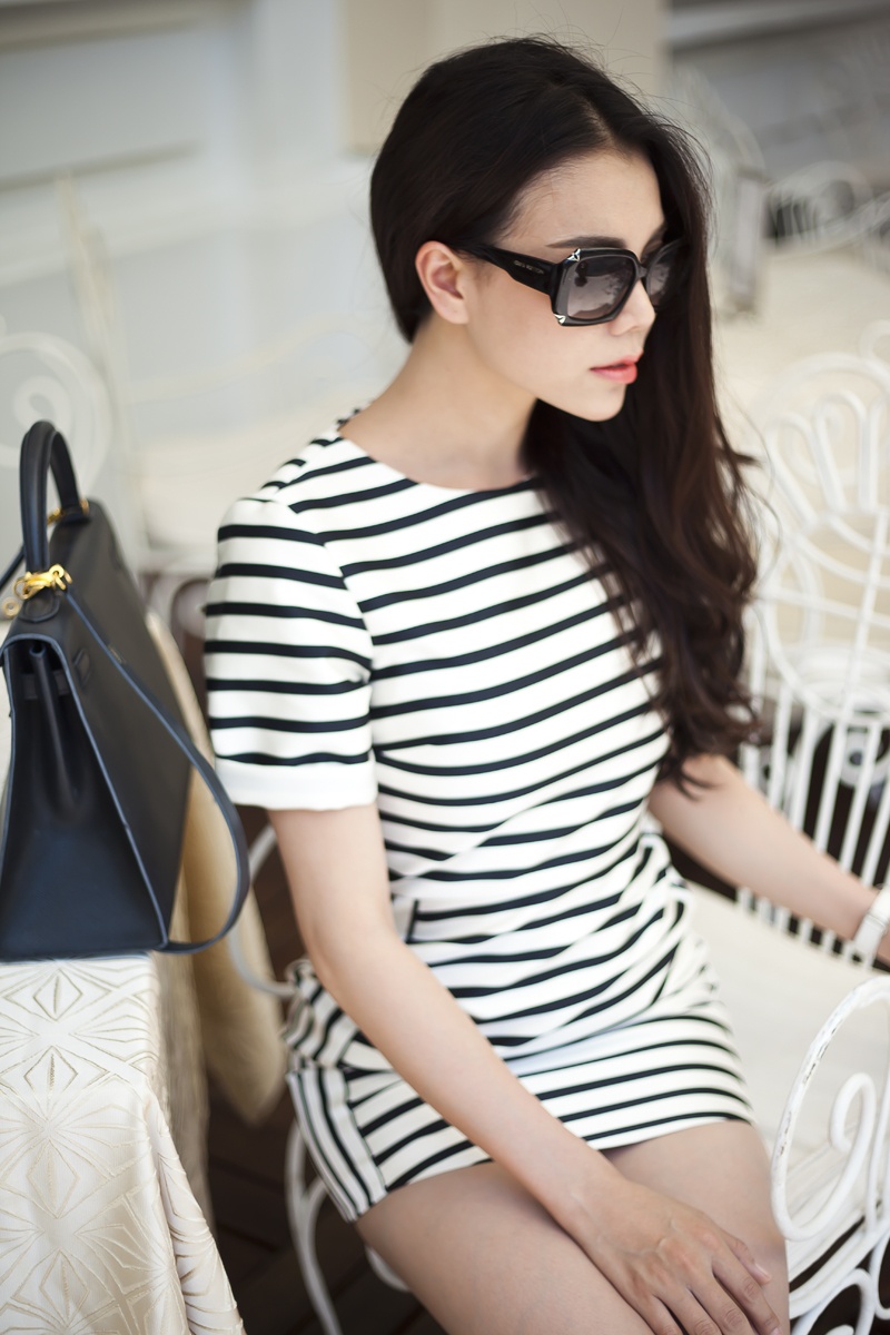 Mốt áo thun giấu quần được Trà Ngọc Hằng ứng dụng khá ổn nhờ kiểu áo không quá ngắn, đi kèm là sọc kẻ hiện đại phù hợp với hình ảnh năng động, tự tin của người mặc.
