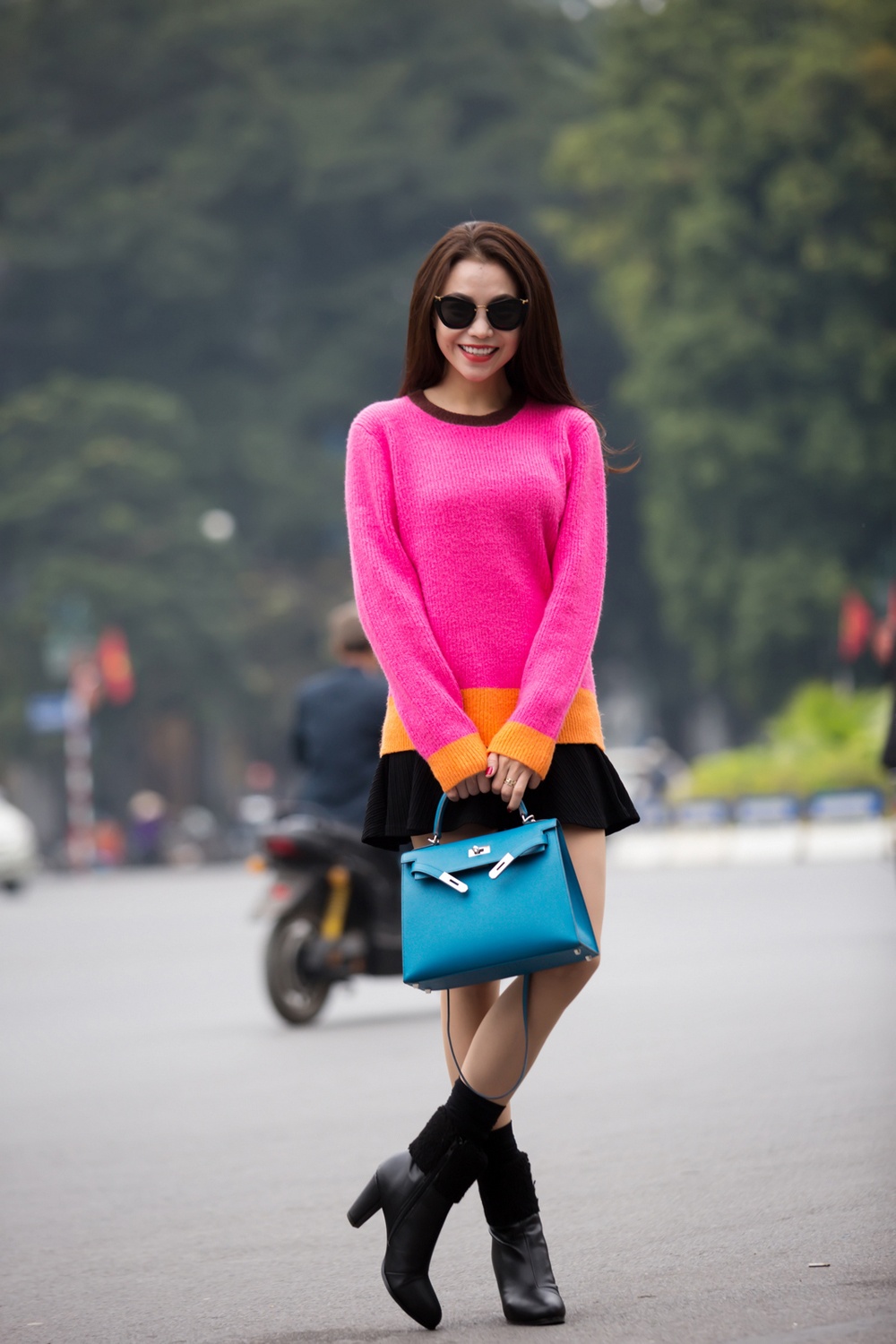 Nữ người mẫu Sài thành thu hút chú ý trên con phố trung tâm Hà Nội với set trang phục tông màu nóng bắt mắt.