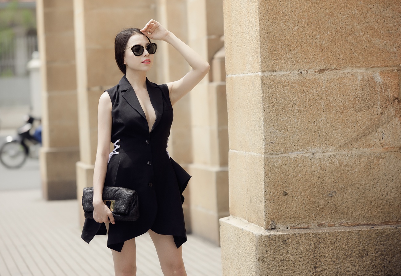 | Bộ váy phom dáng vest tối màu làm nổi bật làn da trắng hồng, tươi tắn của người mặc. Không chỉ có sức hút ở ngoại hình cân đối, nóng bỏng, Trà Ngọc Hằng còn có làn da không tỳ vết, là lợi thế giúp cô nổi bật trong bất kỳ những bộ cánh từ bình dân đến sang trọng. |