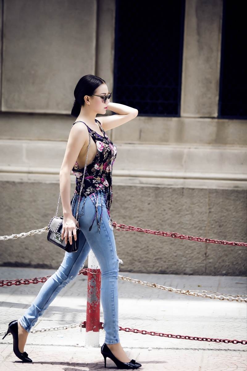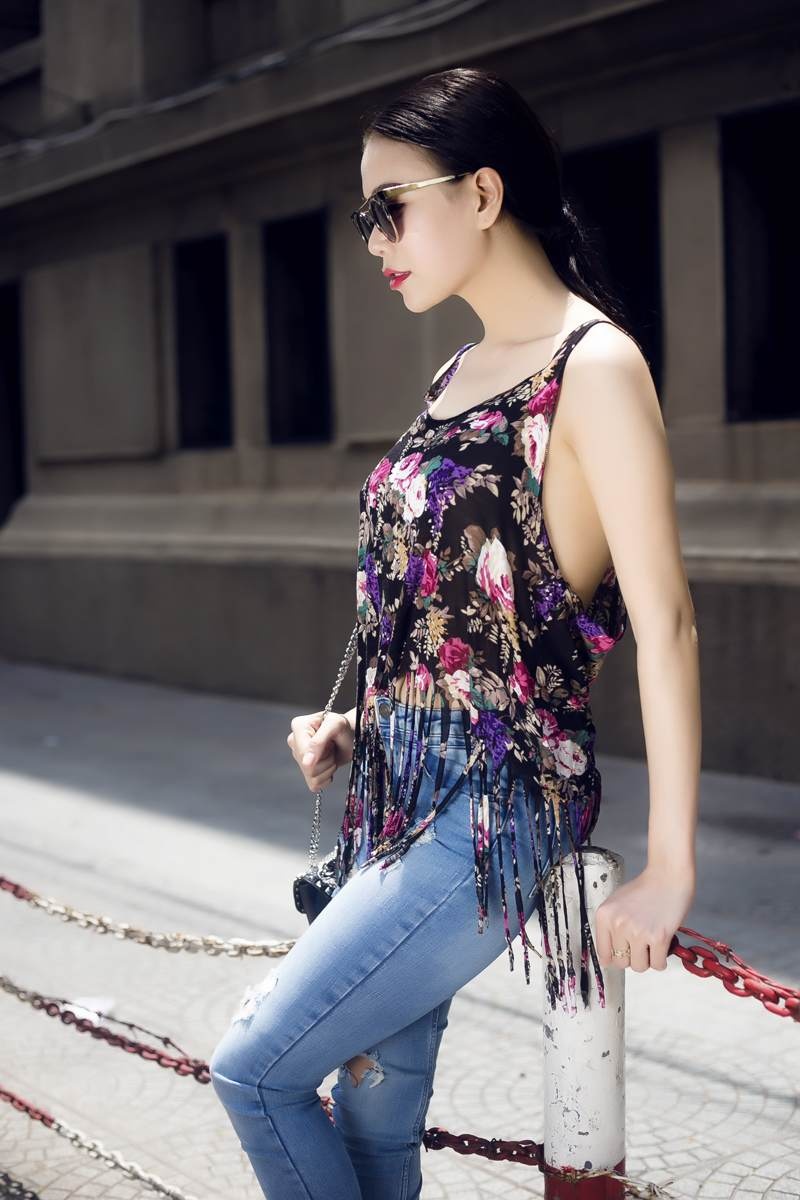 | Ở set trang phục khác, Trà Ngọc Hằng phóng khoáng hơn với cách mix áo thun ba lỗ tua rua và quần jeans ống côn ôm sát. Phụ kiện giày cao gót gam đen mix kèm hòa hợp phong cách. |