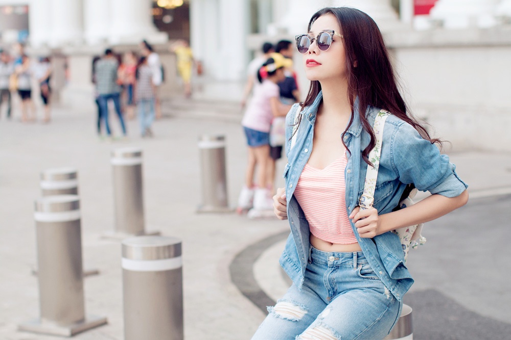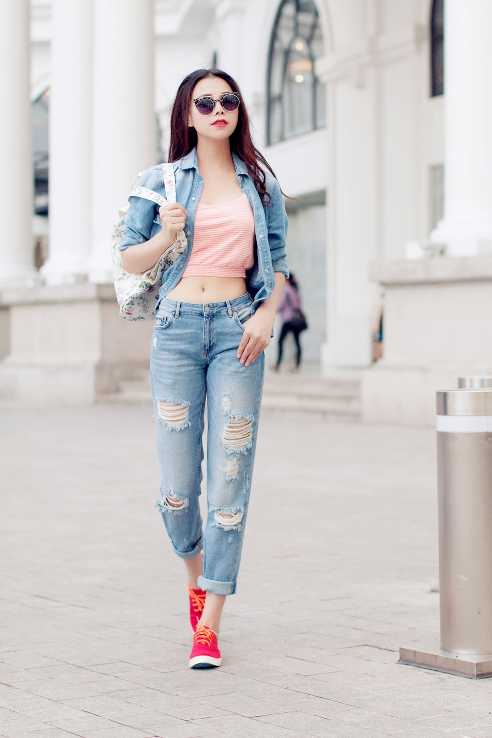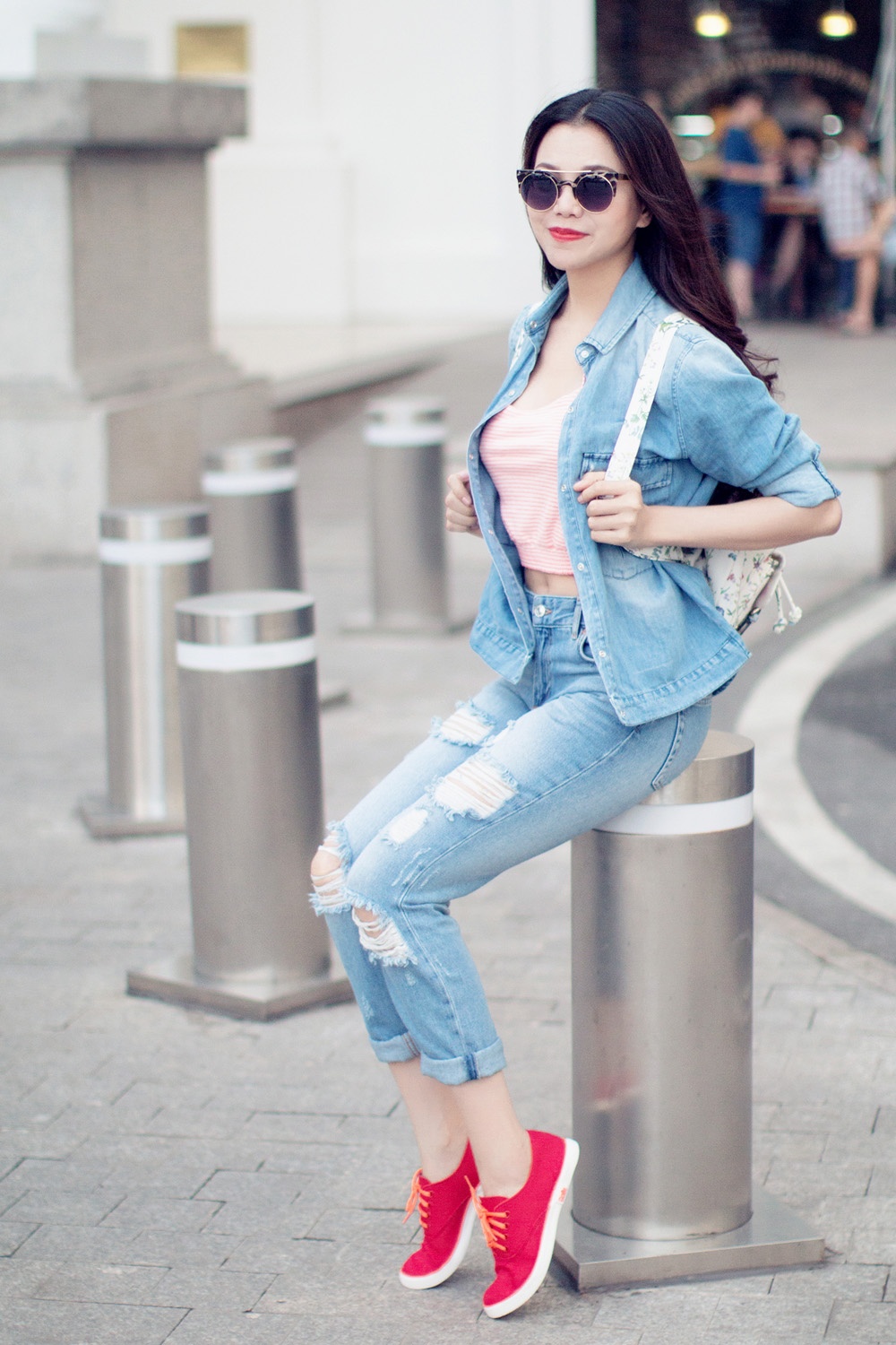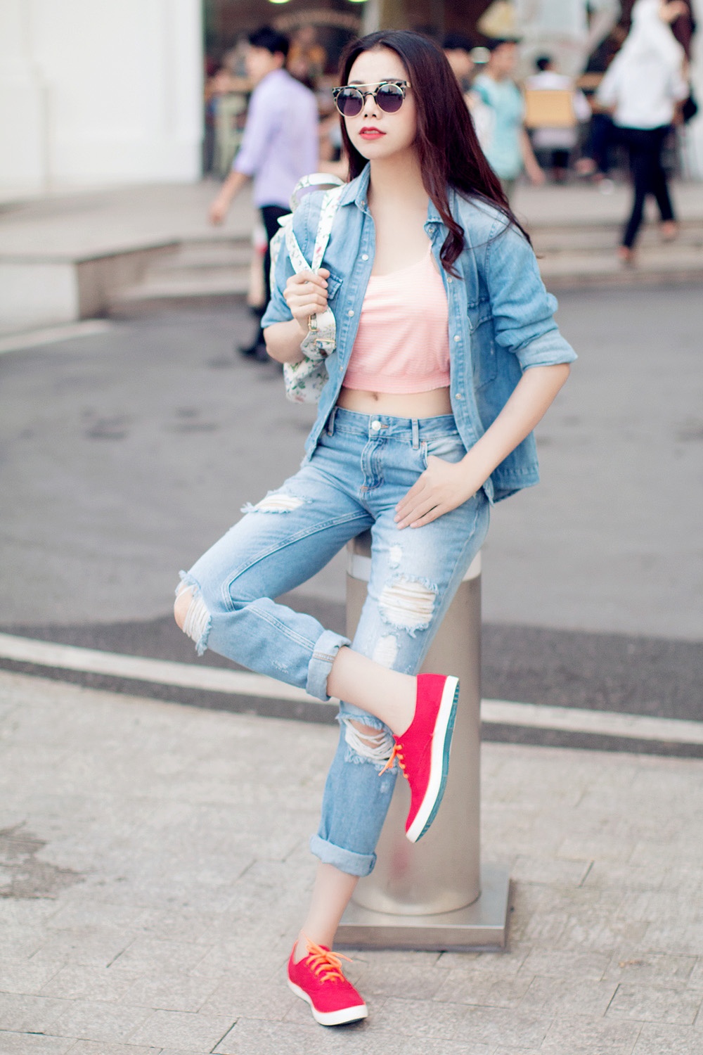 | Tuy nhiên, với xu hướng jeans rách năm nay, chân dài 9X vừa xuất hiện trong bộ ảnh mới với trang phục rất cá tính và "ngầu". Để hợp style với bộ đồ jeans, Trà Hằng khoác thêm ba lô và đi giày đỏ. |