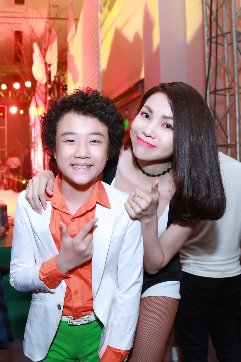 | Nữ ca sĩ tươi cười rạng rỡ và chụp ảnh cùng với nghệ sĩ khác. Trà Ngọc Hằng "bắt cóc" cậu bé tóc xù Hoàng Anh The Voice Kids và trò chuyện khá thân mật. |