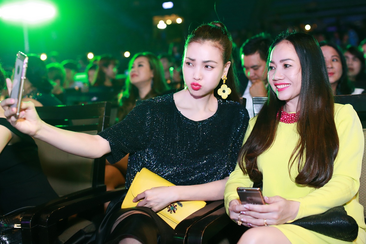 | Nữ người mẫu nhí nhảnh chụp hình kỷ niệm cùng chị gái. Ngồi cạnh cô em nổi tiếng trên hàng ghế VIP, chị Trà Ngọc Hằng ăn vận chỉ chu với váy suông gam vàng. |