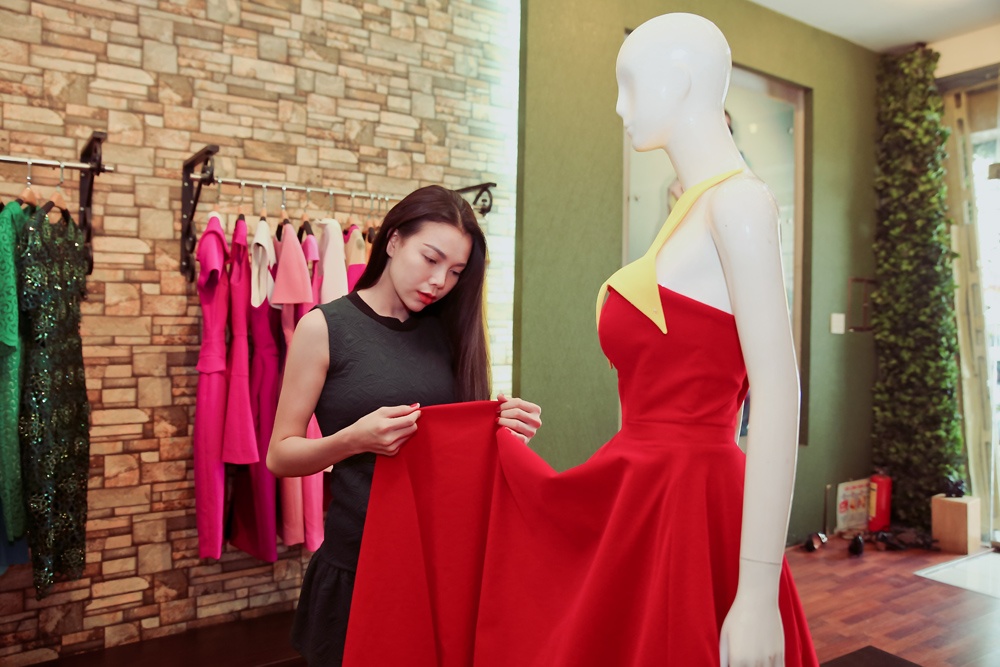 Người đẹp 9X vừa đến thử váy dạ hội đặc biệt lấy hình ảnh lá cờ đỏ sao vàng của nhà thiết kế Huy Trần trên xe sang Range Rover.