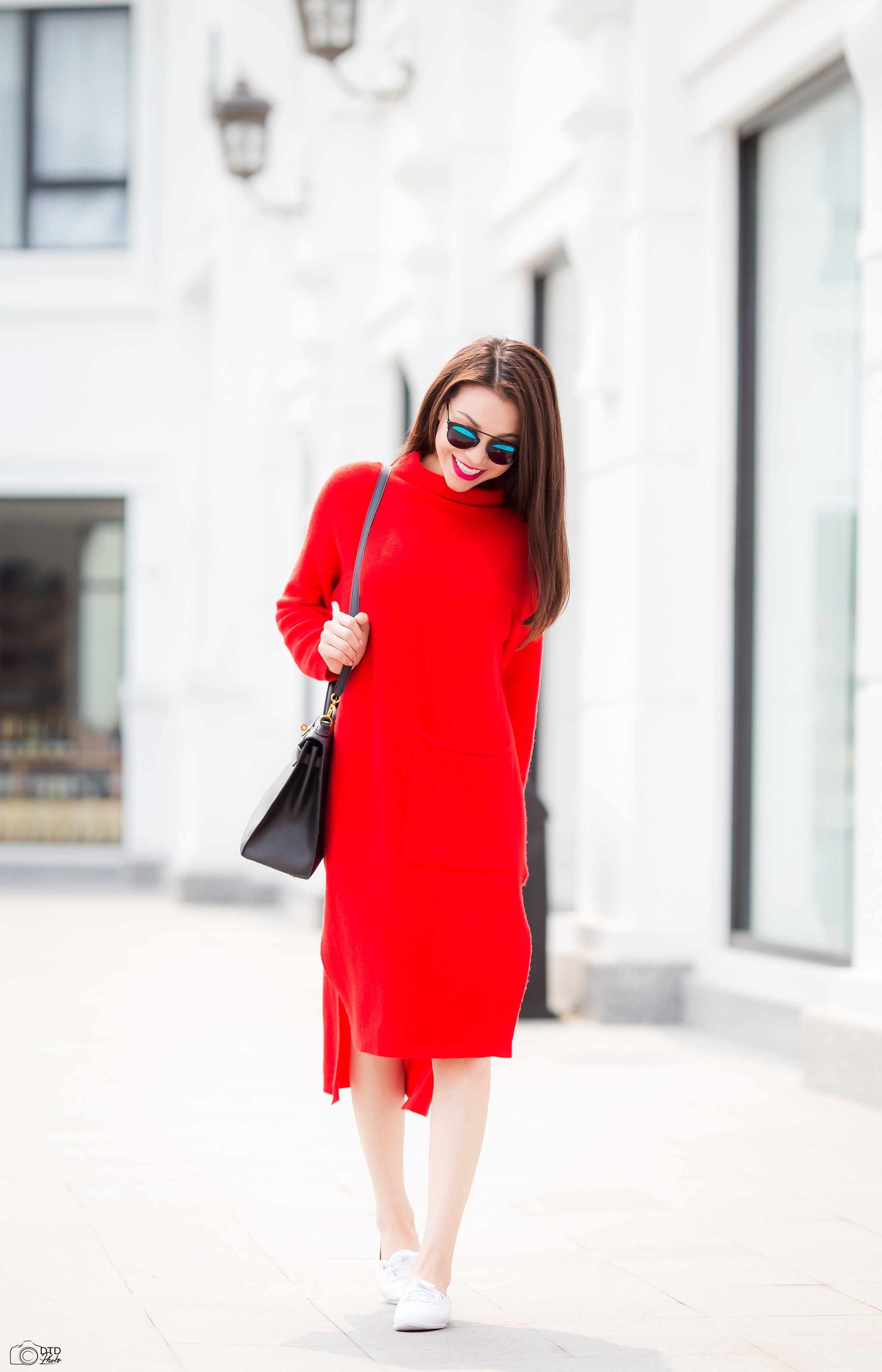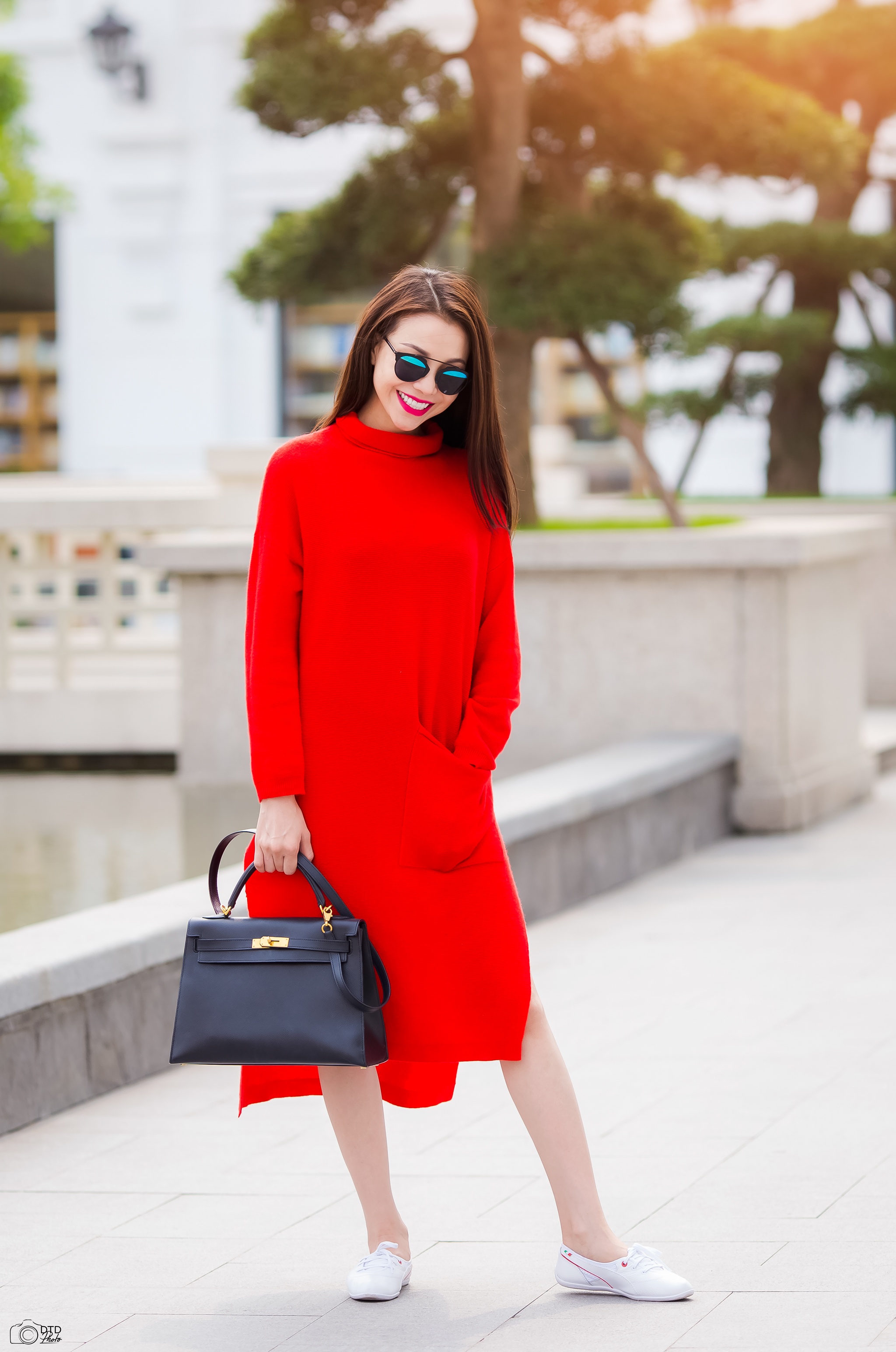 | Chân dài 9X cá tính khi kết hợp bộ đầm dáng suông màu đỏ với giày bata màu trắng và chiếc túi hàng hiệu màu đen. |