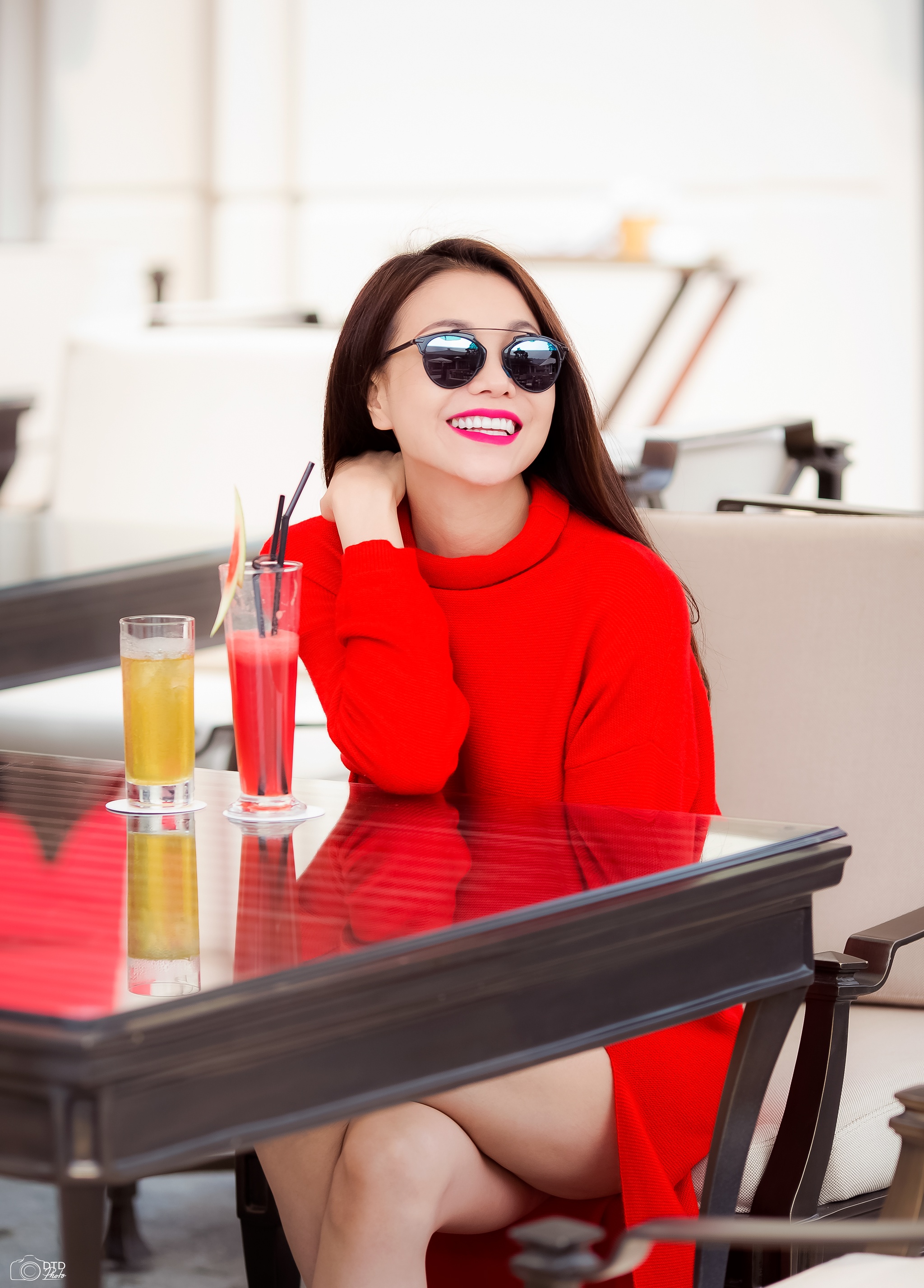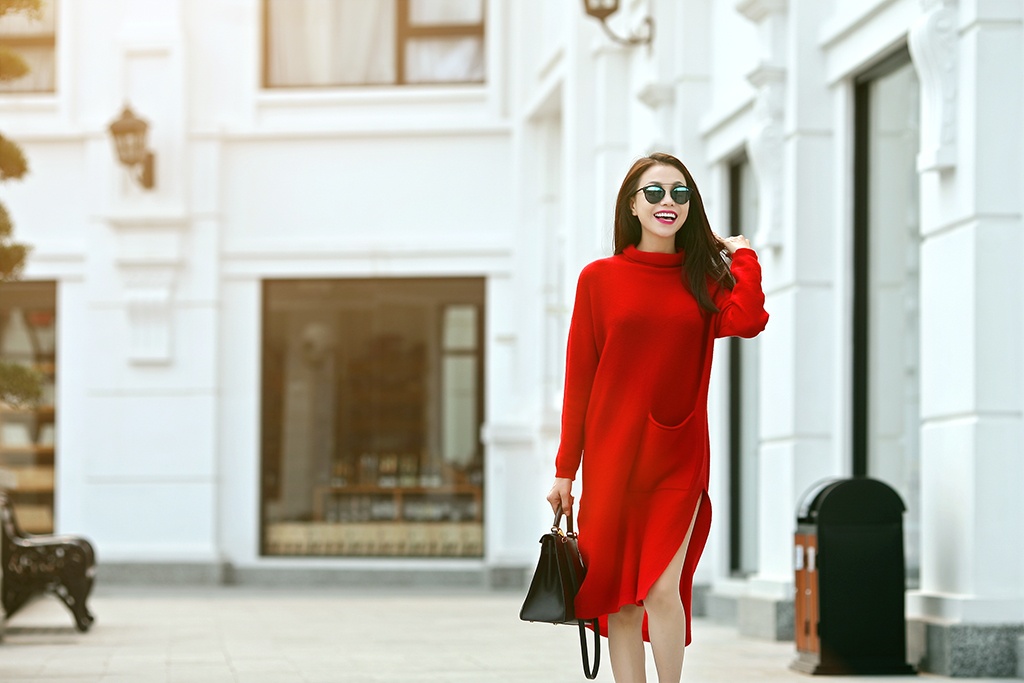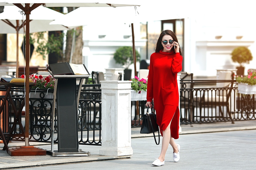 Trà Ngọc Hằng thả dáng trên phố với chiếc đầm dáng dài, màu đỏ rực rỡ. Bộ đầm có chất liệu len nhưng cô nàng đã khéo léo biến thành trang phục dành cho ngày nắng và khoe đôi chân dài gợi cảm. |