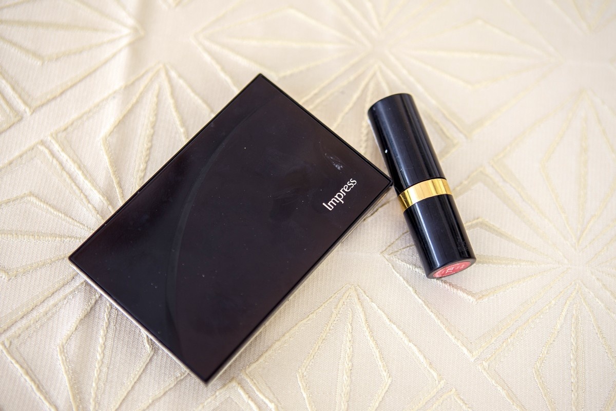 Bộ trang điểm đơn giản, gồm phấn phủ, son môi luôn được mang theo mình.