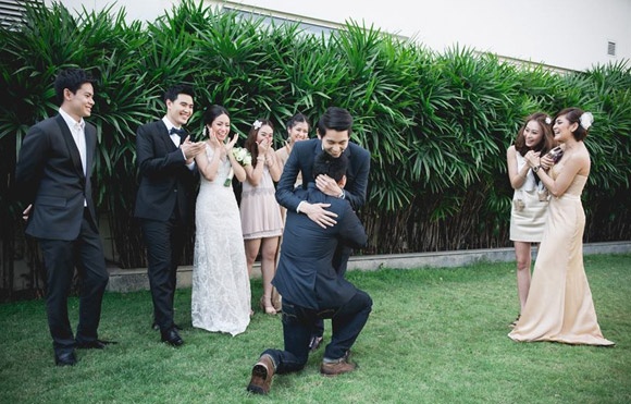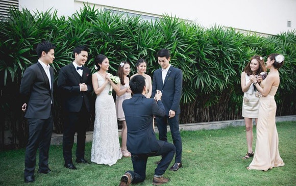 | Trong lúc chụp ảnh kỷ niệm tại đám cưới chàng trai bất ngờ đứng tách ra, cầm tay “bạn gái” thủ thỉ đôi lời rồi quỳ gối, đưa ra chiếc nhẫn nói lời cầu hôn. |