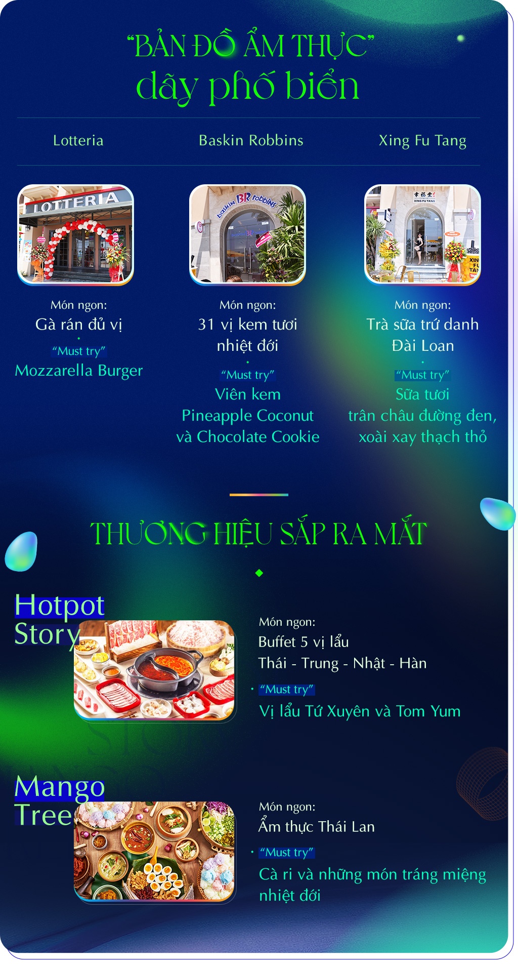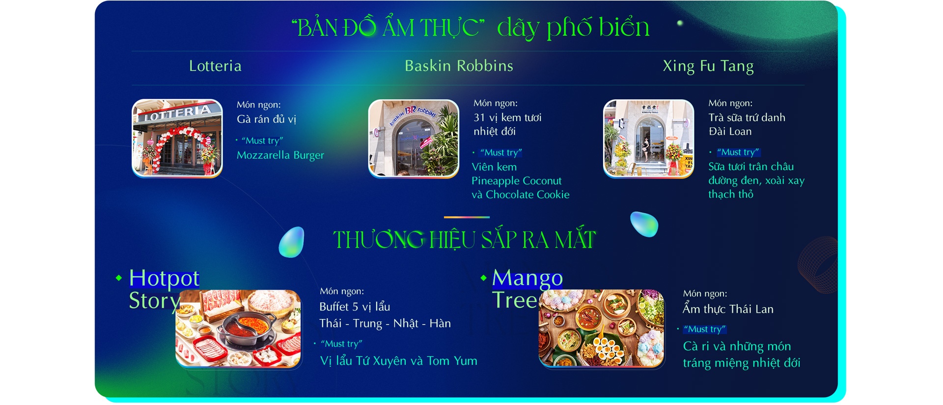 Cư dân và du khách có thể thưởng thức món ngon từ các thương hiệu hàng đầu như cửa hàng thức ăn nhanh Lotteria, kem tươi Baskin Robbins, trà sữa Xing Fu Tang… Hệ ẩm thực phố biển đang dần được bổ sung các mảnh ghép đến từ những thương hiệu nổi tiếng như Hotpot Story, ẩm thực Thái Mango Tree…