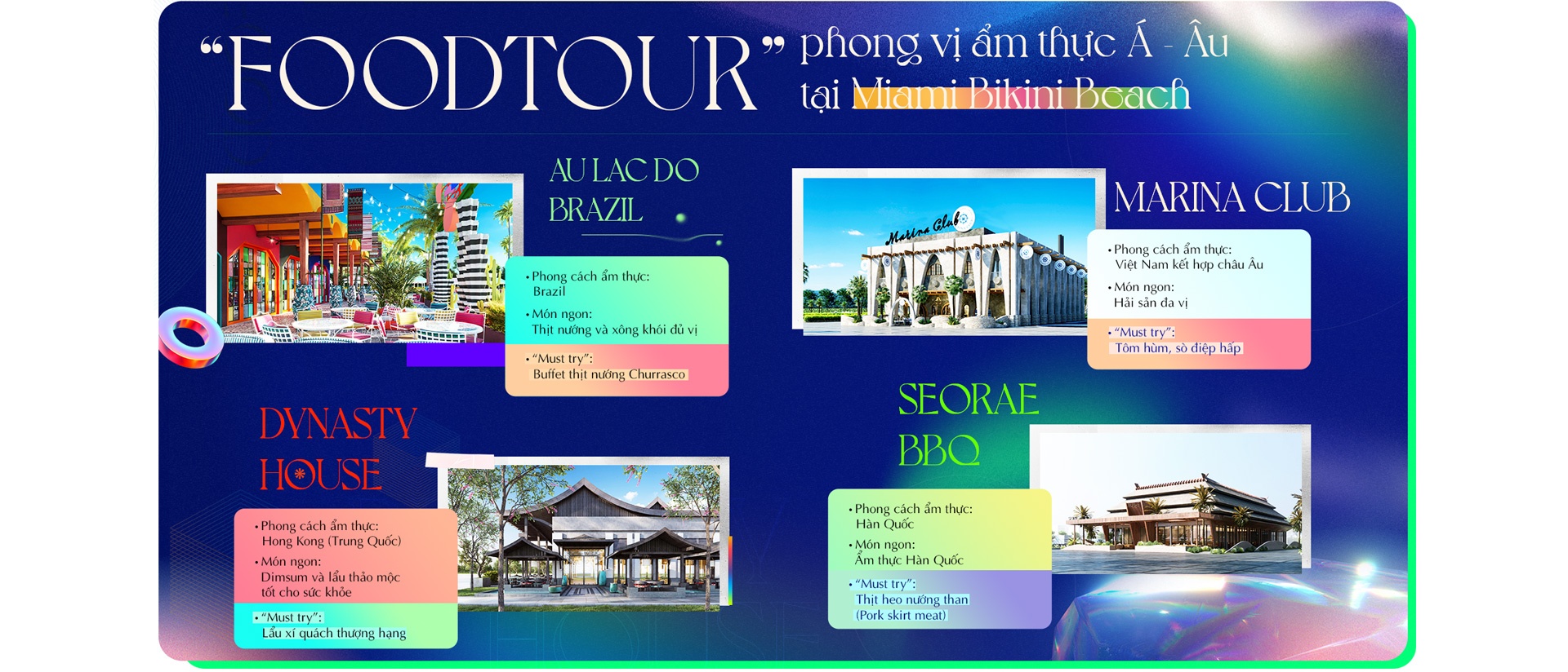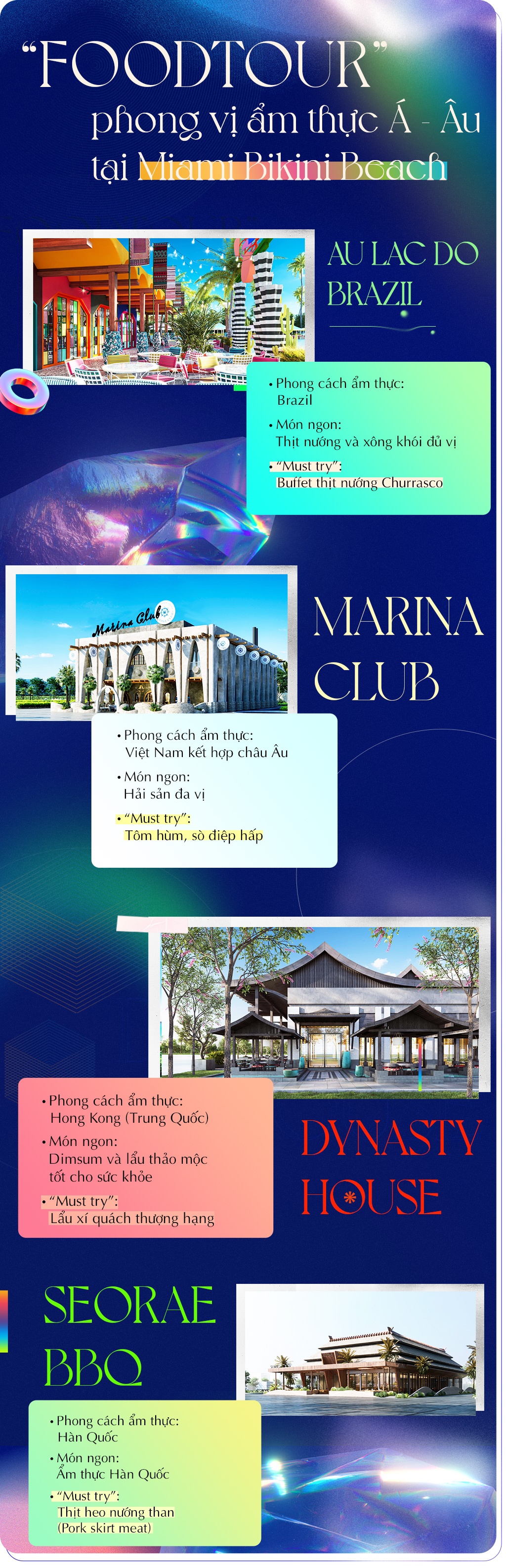Bạn có thể thử menu tràn ngập món Nam Mỹ tại Au Lac Do Brazil, hít hà hương thảo mộc của nồi lẩu Hong Kong tại Dynasty House, quây quần nướng thịt kiểu Hàn Quốc với bạn bè tại SeoRae BBQ hay tận hưởng vị hải sản tươi ngọt đặc trưng bản địa tại Marina Club. Chuỗi nhà hàng ẩm thực đa sắc màu dự kiến đi vào hoạt động tại quảng trường biển Miami Bikini Beach vào quý IV, chắc chắn sẽ giúp chuyến “du ngoạn vị giác” của bạn trở nên thi vị hơn.