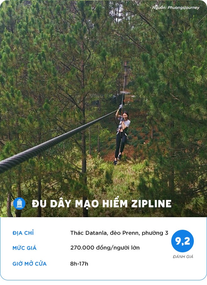 Ở trò chơi này, bạn sẽ khám phá Đà Lạt bằng một lối đi riêng, băng qua núi rừng, nhìn xuống dưới là thác, suối và cây xanh. Du khách cần chuẩn bị thể lực tốt và dành thời gian tập luyện trước khi chinh phục đường dây dài bắc ngang cánh rừng. Trải nghiệm mọi thử thách của cuộc chơi, bạn thấm mệt với mồ hôi nhưng đổi lại là cảm giác sảng khoái khi vượt qua giới hạn.
