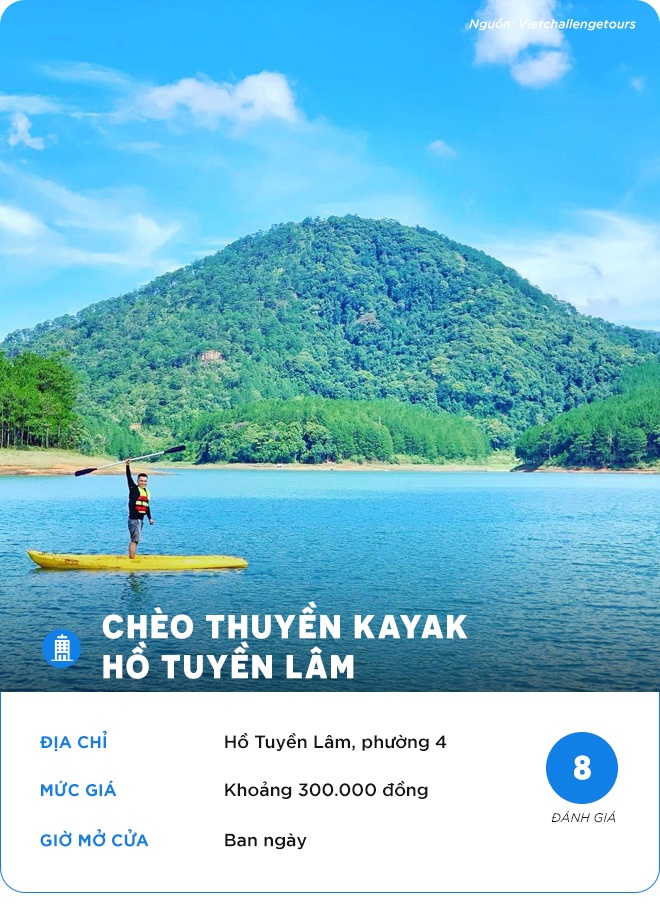 Chèo thuyền kayak ở hồ Tuyền Lâm, bạn sẽ lướt trên mặt hồ, tận hưởng cảm giác nhỏ bé giữa mênh mông sóng nước. Hành trình vui chơi sẽ thêm phần thú vị với những cuộc đua thuyền cùng bạn bè. Du khách cũng thường kết hợp chèo thuyền kayak và cắm trại tại hồ Tuyền Lâm. Ngoài ra, vào thời điểm từ khoảng tháng 10 đến giữa tháng 12, bạn còn có thể đi thuyền ngắm cảnh lá phong đổi sắc đầy thơ mộng ngay bên hồ.