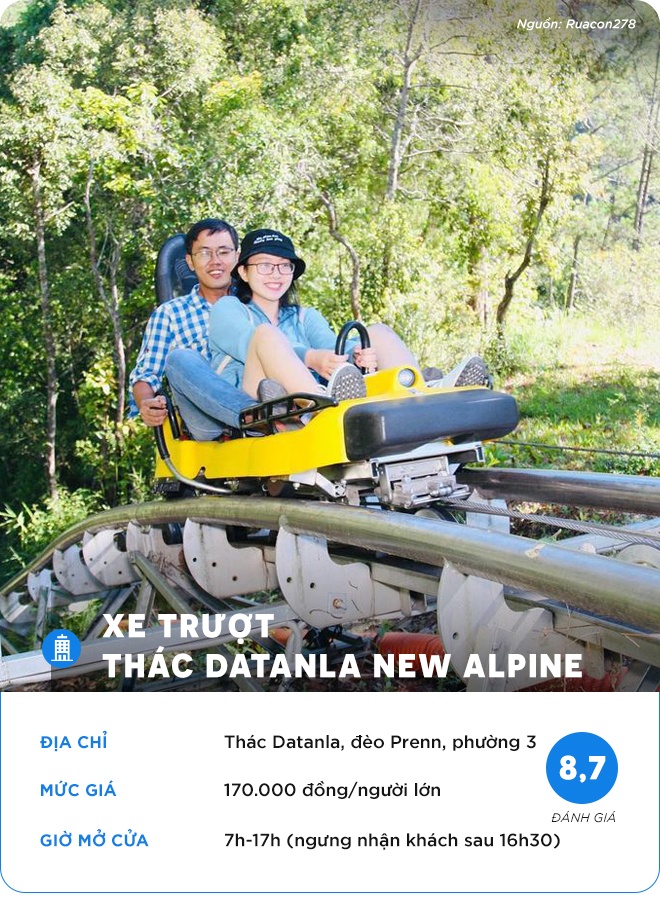 Với 2.400 m, hệ thống đường trượt ở khu du lịch thác Datanla là đường trượt dài nhất Đông Nam Á. Trải nghiệm trò chơi này, bạn ngồi trên xe trượt và di chuyển theo đường ray có các khúc quanh co, lên xuống. Chuyến đi của bạn sẽ xuyên qua rừng và thác nước cheo leo. Bạn vừa được ngắm cảnh thiên nhiên 2 bên, vừa tận hưởng không khí trong lành, mát mẻ.