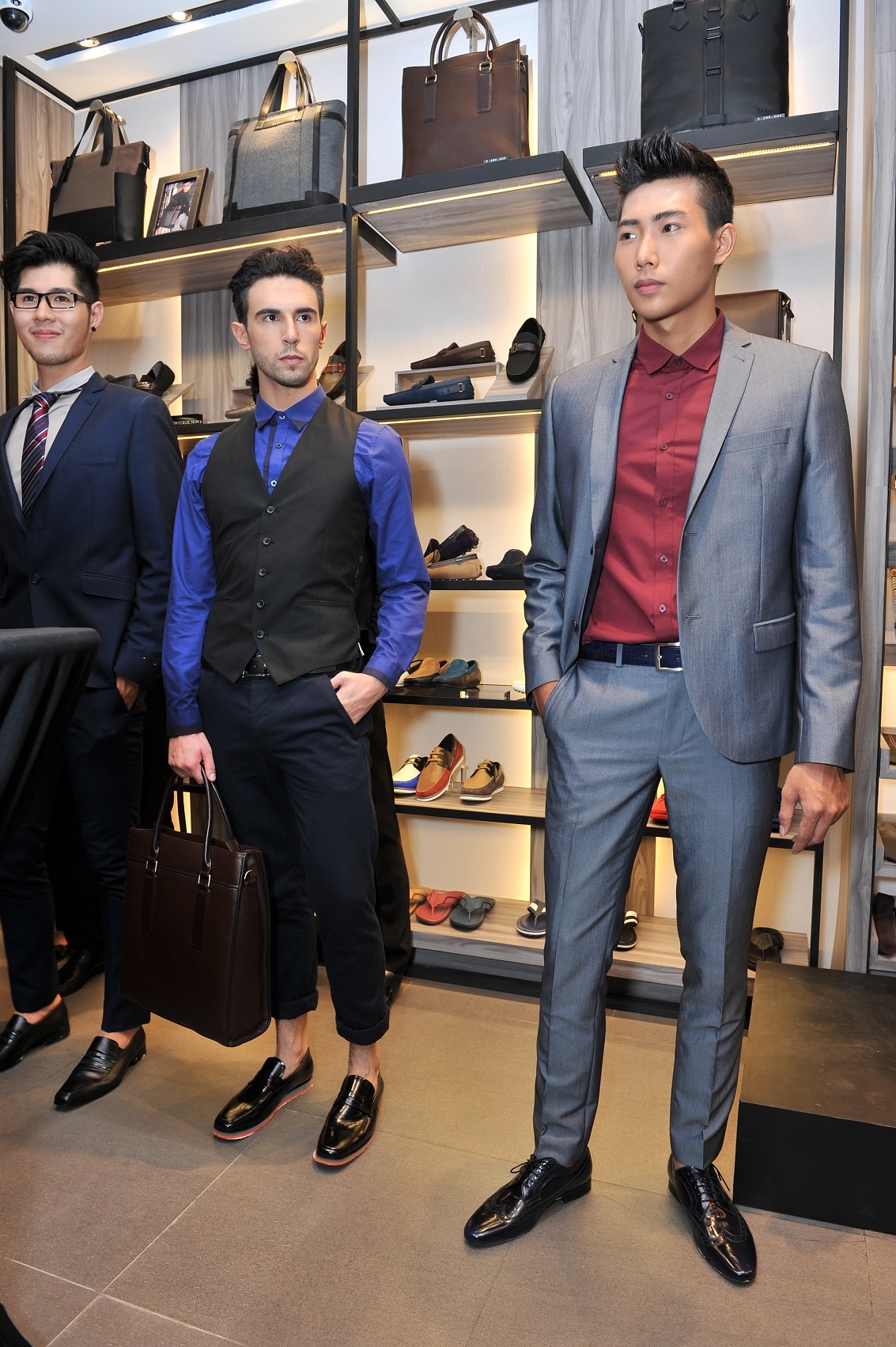 | Các chàng trai Nguyên Anh, Lucas và Hữu Long (từ trái qua) trong trang phục: công sở, dạo phố và dạ tiệc. |